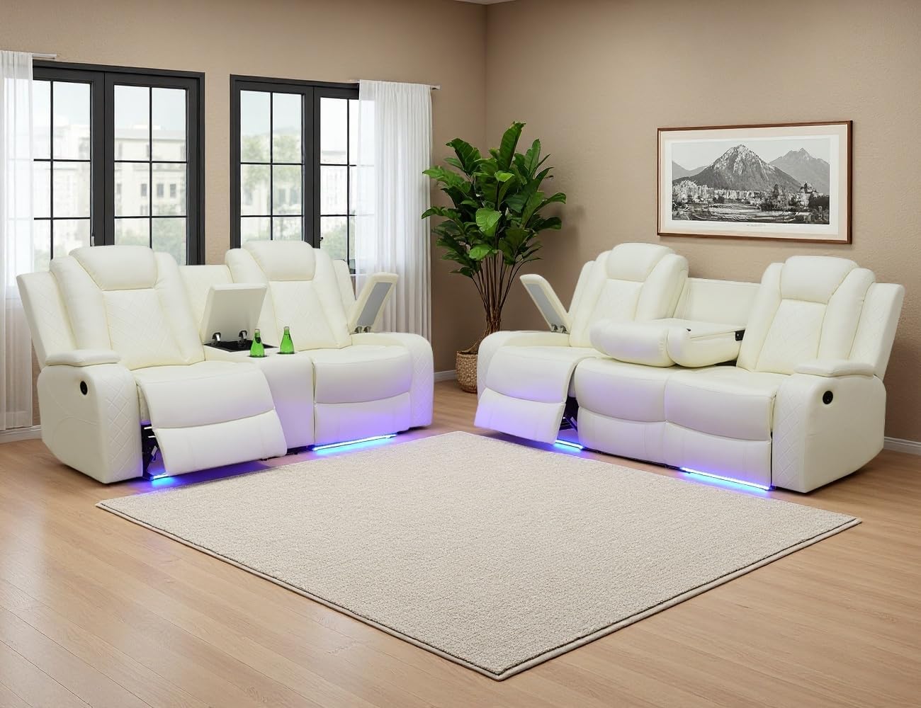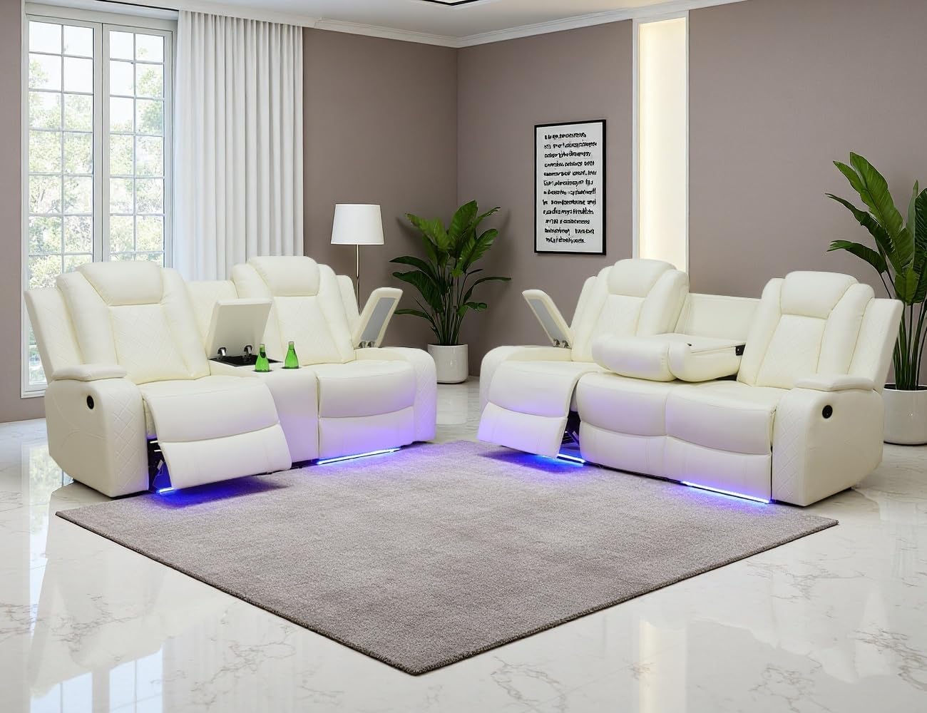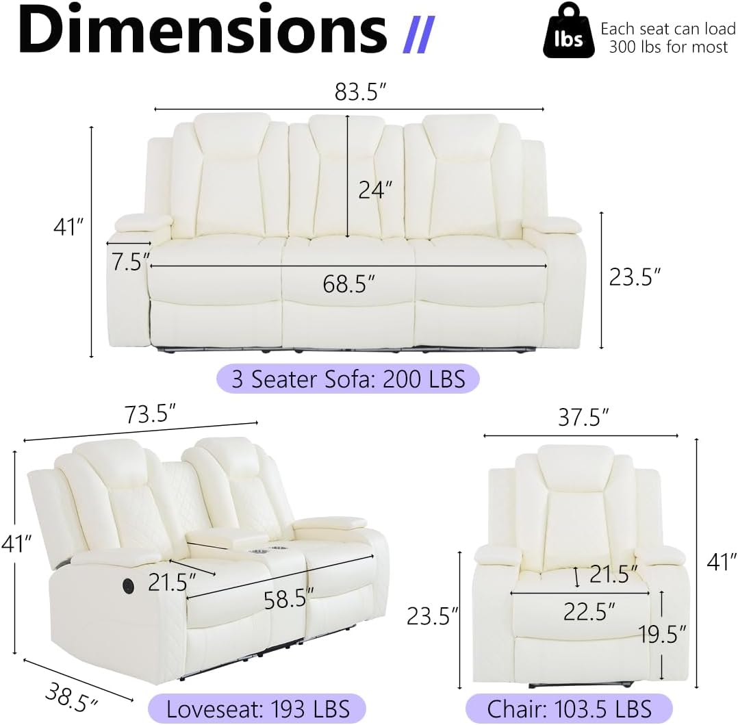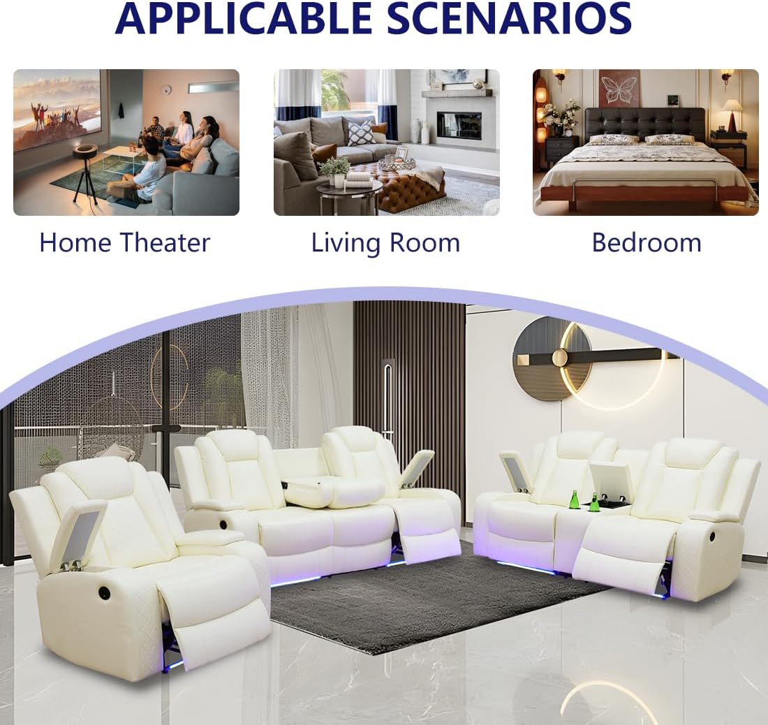 Convenient Functions: Each armrest features hidden stroage to store small sundries. The center backrest of the 3-seater sofa can turn into a coffee table with 2 ready-to-charge zones when pulled down; the center headrest can be flipped back to a touchable and 360° adjustable read light. The center of the loveseat is a hidden storage console with 2 cup holders. These considerate designs can bring you a more convenient and comfortable life.