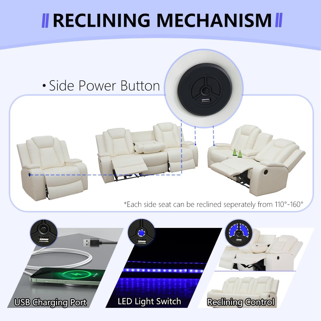 Separate Reclining Design: The separate power reclining mechanism allows you to recline one back from 110° to 160° while keeping the other backs upright. The 3-seater sofa and 2-seater sofa features 2 reclining seats on each side.The padded head rest and back support are designed for your healthy sitting posture, bringing an ultimate relaxation.