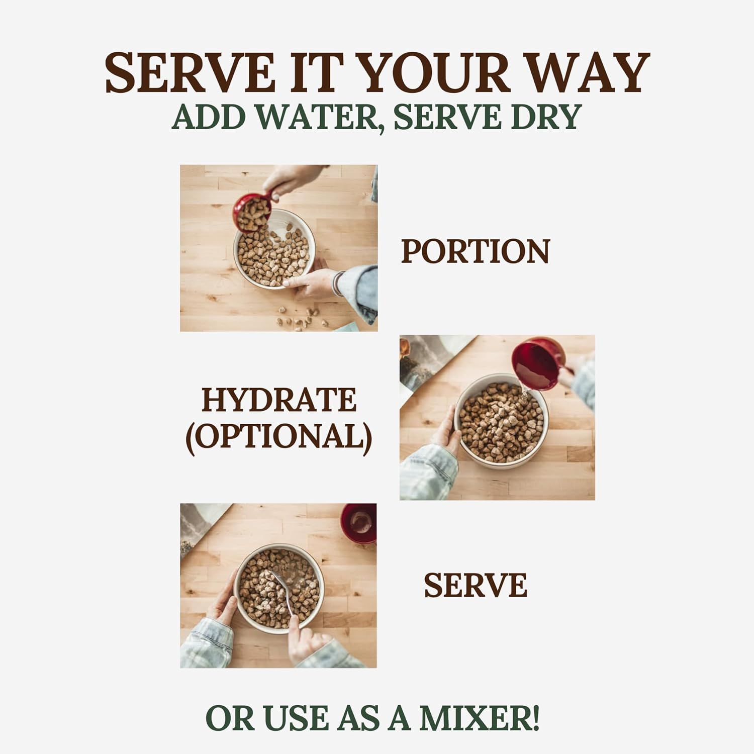 Serve as a Meal or a Topper – Use as your dog’s complete meal or sprinkle over their usual food for added variety and taste. If using as a topper, reduce the amount of their current food to avoid overfeeding.