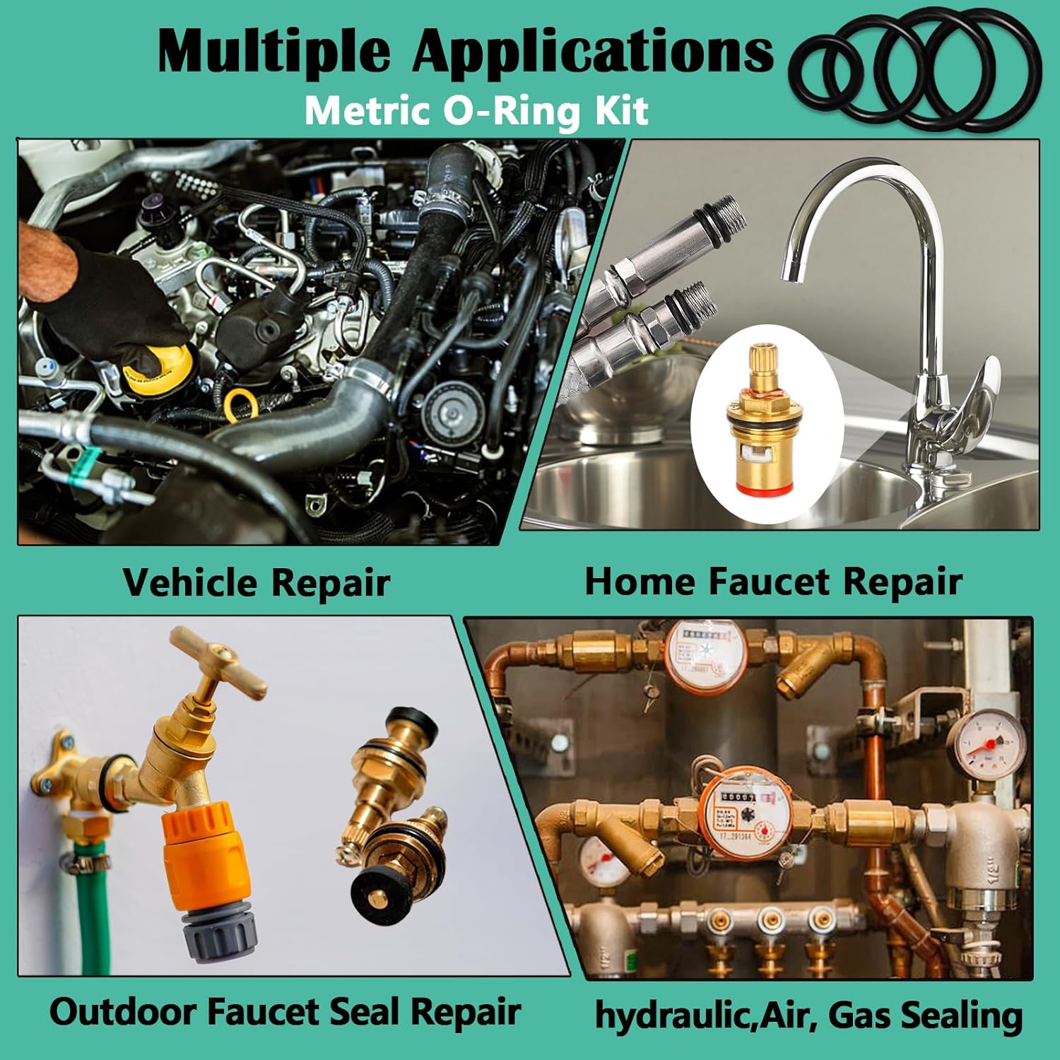 O ring assortment kit : includes 916 pieces of 18 kinds of black oring set made of NBR material with excellent resistance to heat and oil, used for faucets plumbing, pressure washer, hose nozzles,sinks,auto engines,machinery bearings, pumps,boats,oils,gas control valve,spray,air,water fitting seal leak repair