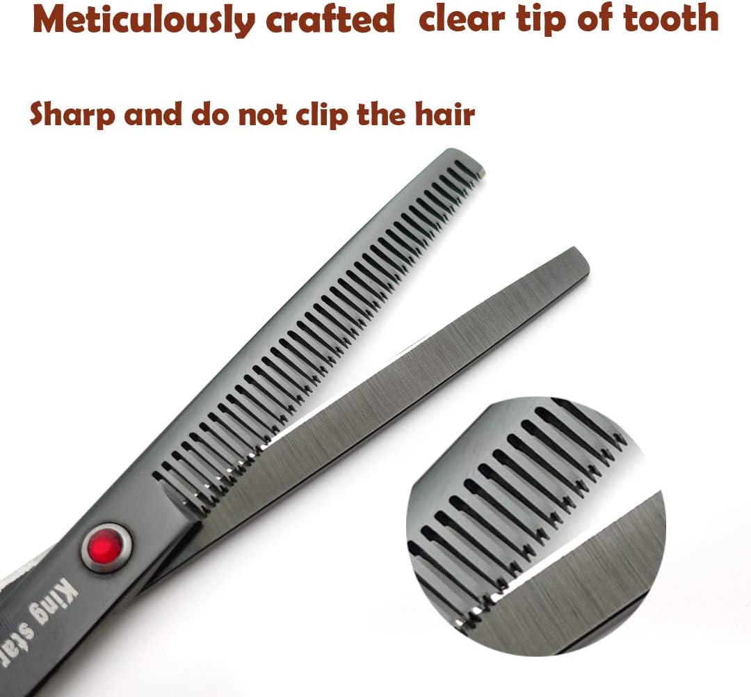SHARP CONVEX EDGE .The edge line of the blade is evenly polished, using the convex arc design to increase the thrust of scissors,to make the cutting of these dog grooming scissors professional and more smooth and stable.With meticulously crafted clear tip of tooth ,the thinning scissors are sharp and do not clip the hair.
