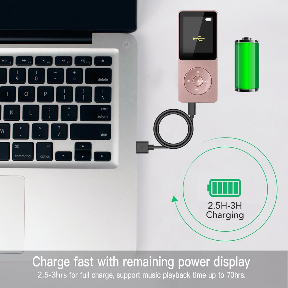 Up to 70 hours of music playback when fully charged with full-charge time: 1.5 hours.; 12 hours FM Radio playback.