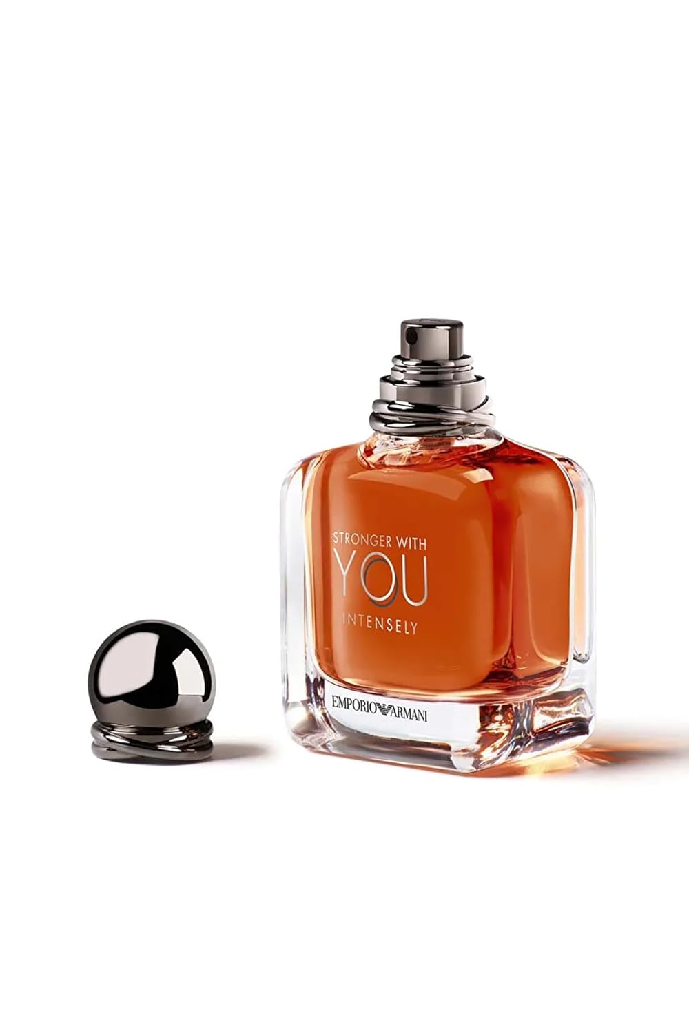Stronger With You’s iconic glass bottle follows strong lines and curves reminiscent of masculine shoulders. It is topped with the signature metallic gunmetal gray cap.