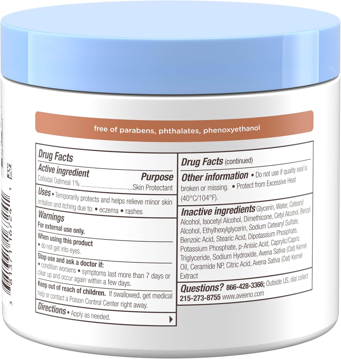 Aveeno Baby Eczema Therapy Nighttime Face & Body Balm is a targeted eczema treatment that soothes and relieves dry, itchy baby skin with long-lasting moisture. Clinically proven to moisturize to relieve and help prevent dry, itchy skin and awarded the National Eczema Association Seal of Approval, this gentle formula is designed for nightly care of sensitive skin. The rich, therapeutic balm harnesses Triple Oat Complex with antioxidant and prebiotic moisturizers, plus hydrating lipids including Ceramides and Glycerin, to reinforce baby’s natural moisture barrier. Our eczema balm forms a barrier that seals in moisture and helps keep impurities out so delicate skin stays calm and protected through the night. Hypoallergenic with no added fragrance, steroids, and parabens, it’s HSA/FSA eligible and suitable for daily use on the face and body. From Aveeno Baby, a pediatrician and dermatologist recommended brand, this body balm is gentle enough for sensitive skin and a trusted addition to add to baby’s routine before the onset of rashes and dryness. For best results, smooth a thin, even layer onto clean, dry skin as part of your bedtime routine, focusing on areas prone to dryness and itch, and reapply as needed to help maintain comfort between baths and to support baby’s skin moisture barrier. Available in an 11 oz size to last through frequent applications for face and body.