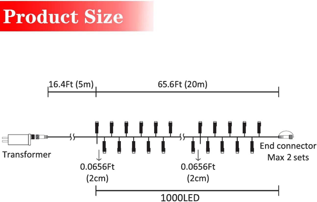 High Quality: 1000 LED 82ft Christmas cluster lights with solid construction plastic material, adapter powered. 29V low voltage string lights with UL 588 certified for safety use. Length between lights : 0.8 Inches, power line: 16.4ft. light string: 65.6ft, length totally: 82ft approx.