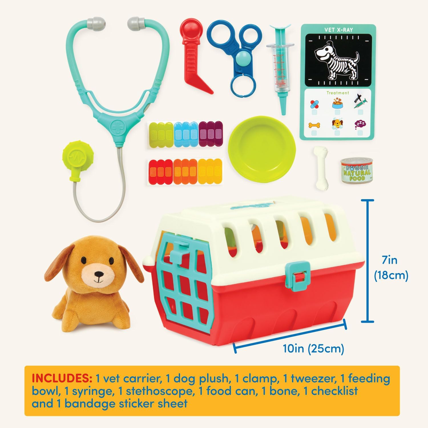 11-Piece Set: Includes 1 plush pup, 1 pet carrier, 1 sheet of bandage stickers, 1 vet checklist, 1 stethoscope, 1 pair of tweezers, 1 clamp, 1 syringe, 1 feeding bowl, 1 can of dog food, and 1 dog bone.