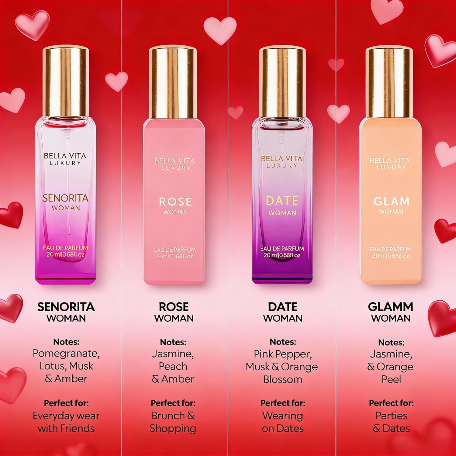 🎁 Luxury Perfume Gift Set for Women: Discover four signature scents—DATE, SENORITA, GLAM & ROSE—in this perfume gift set for women. A perfect choice among perfumes for women, combining floral, sweet, musky, and vanilla perfume notes. It’s more than a perfume set—it’s a full fragrance experience designed for every mood and moment.