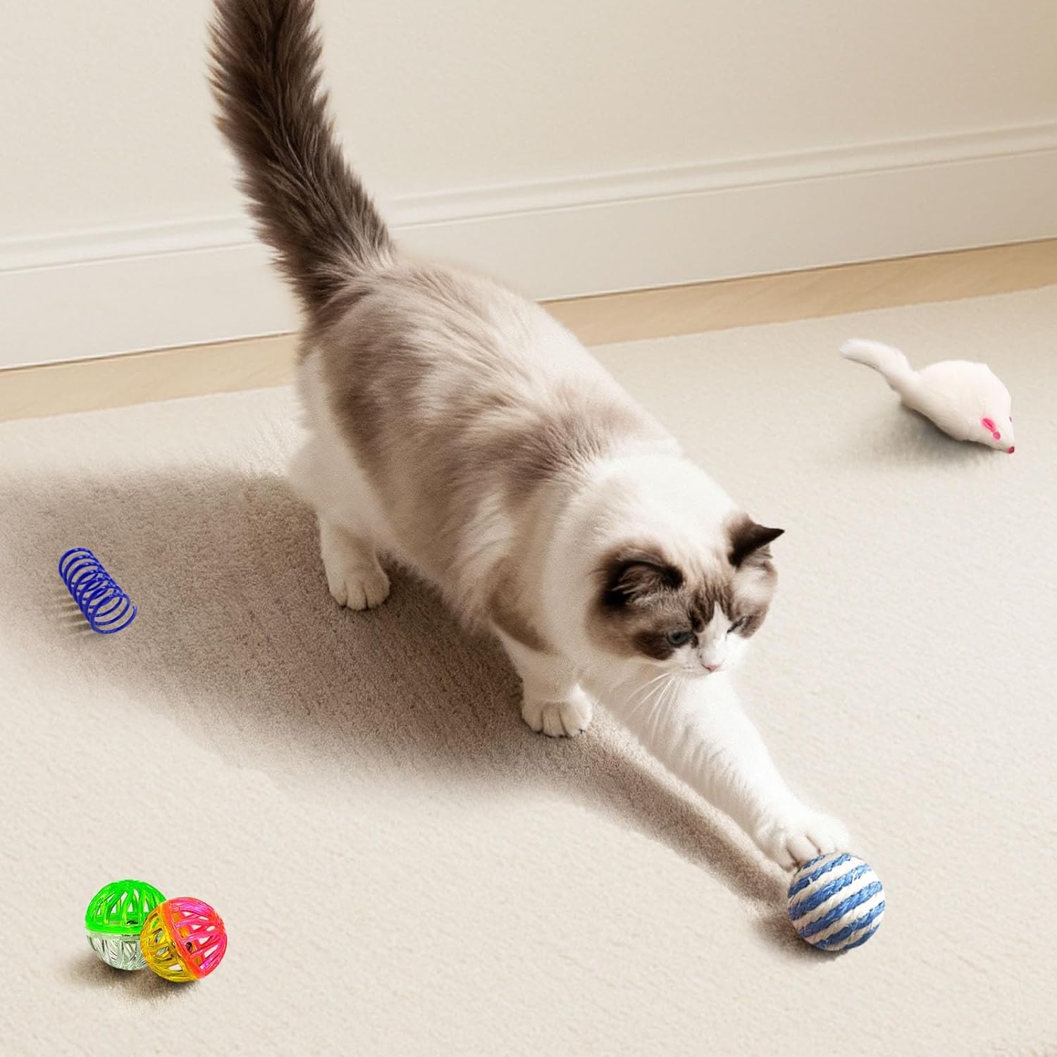 [ Interactive Cat Toys Set Includes]: 10pcs cat springs, 2pcs catnip ropes, 4pcs cat springs, 4pcs color bell balls, 4pcs black and white mouse, 4pcs colorful mouse, 4pcs pompom balls, 2pcs sisal balls, cat’s favorite toys in a variety of styles to keep them happy all day long!🎨