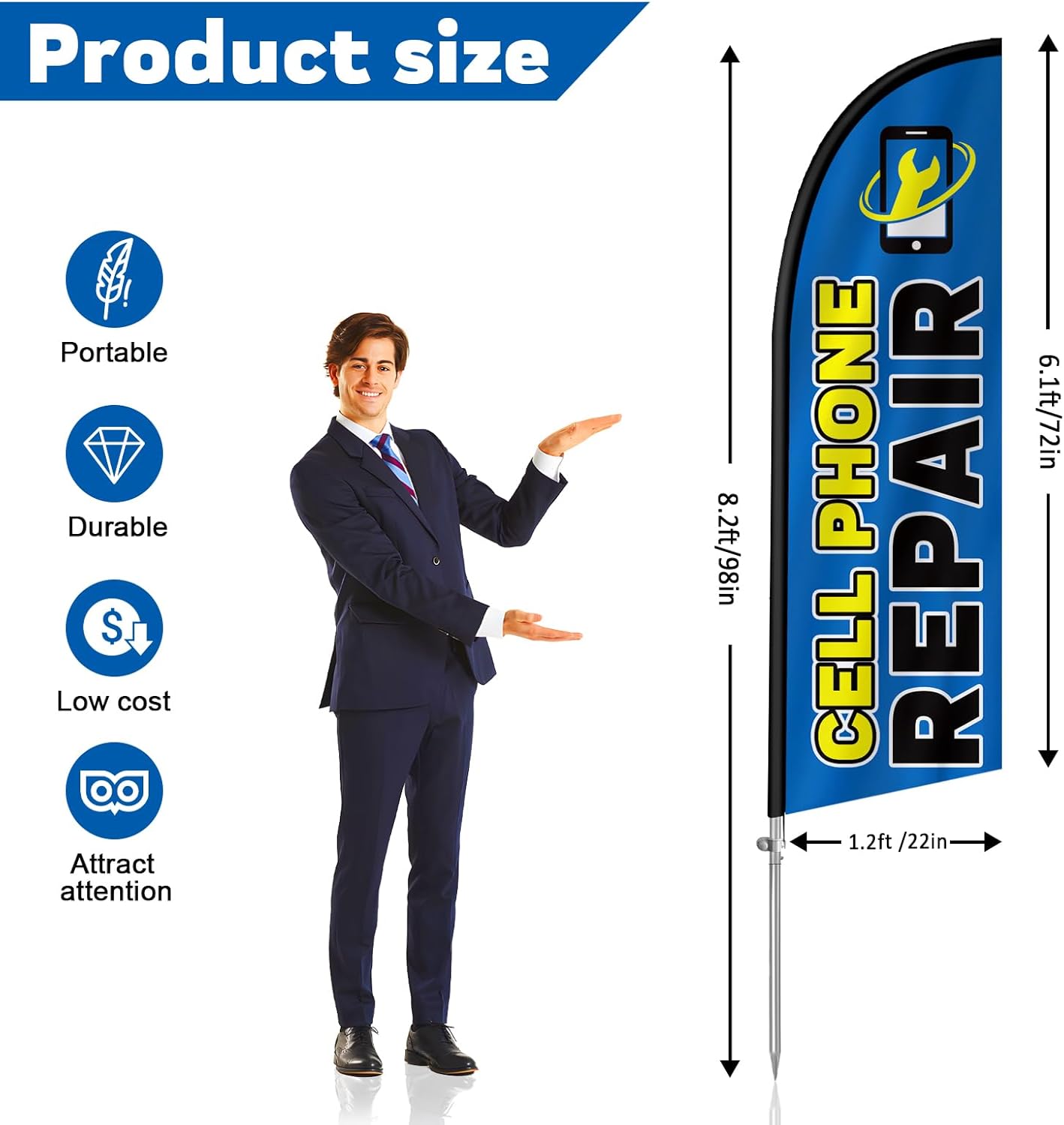Assembly: Cell phone repair feather flag easy to assemble,disassemble,carry and move without taking up space. quickly displaying your Advertising message