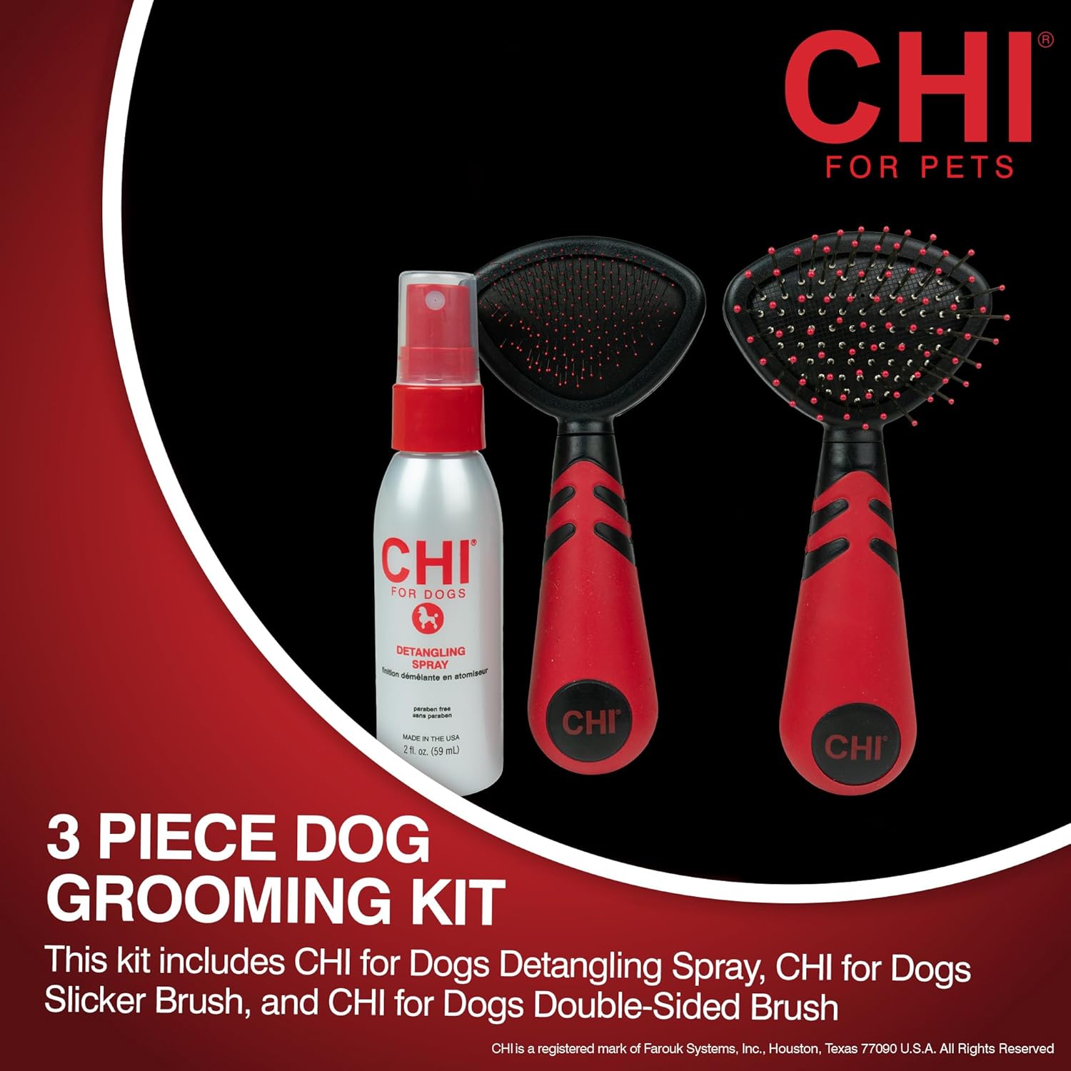 3 PIECE DOG GROOMING KIT – This kit includes CHI for Dogs detangling spray, CHI for Dogs Slicker Brush, and CHI for Dogs Double-Sided Brush.