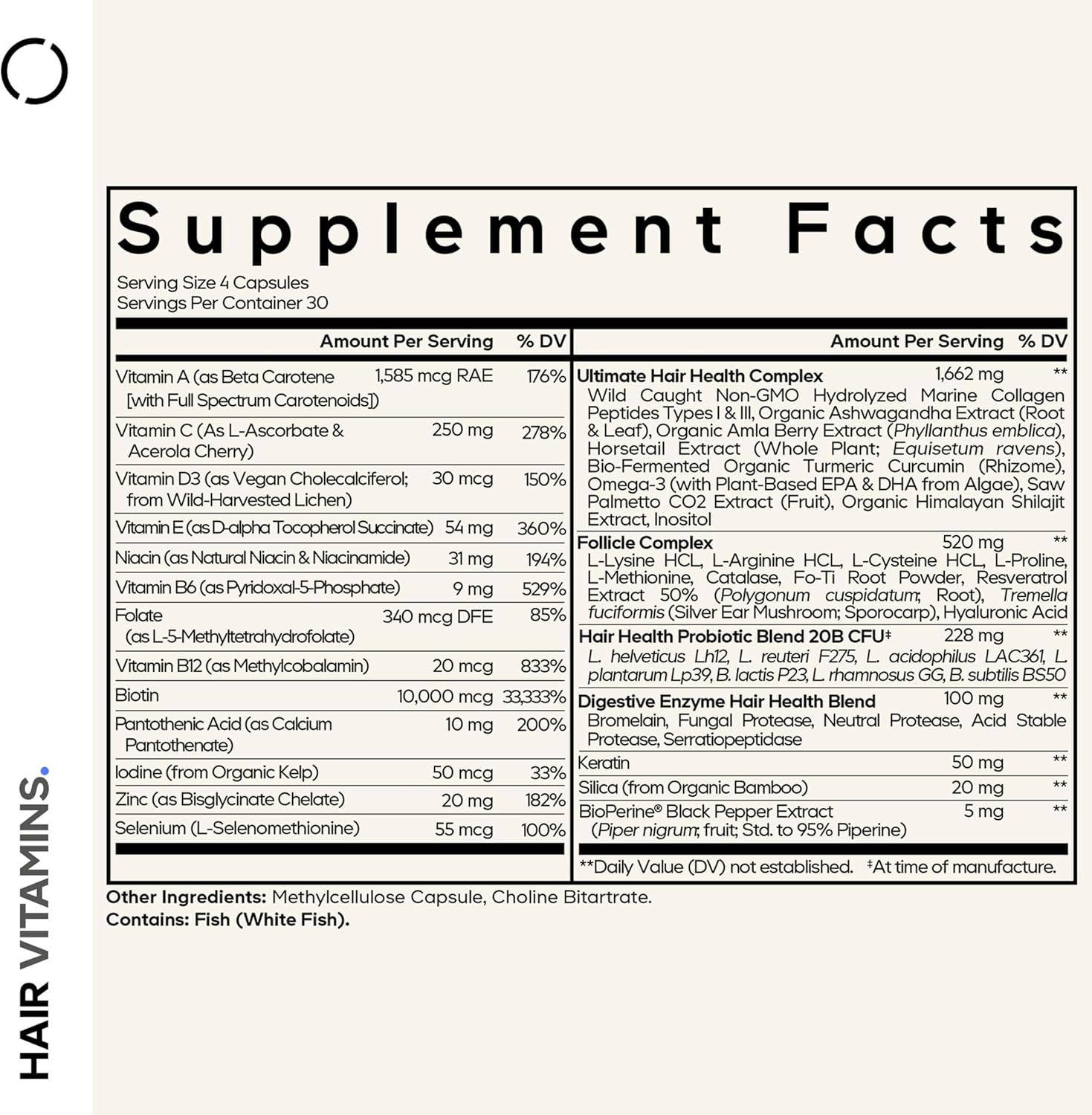 Comprehensive Hair Nutrient Blend: Codeage Hair Vitamins supplement features 10,000 mcg of biotin, hydrolyzed wild-caught marine collagen types I and III, keratin, and essential vitamins A, B6, B12, C, D3, and E—all in one formula to complement your hair care routine. It also includes omega-3 with plant-based EPA and DHA.