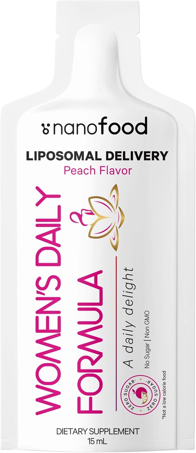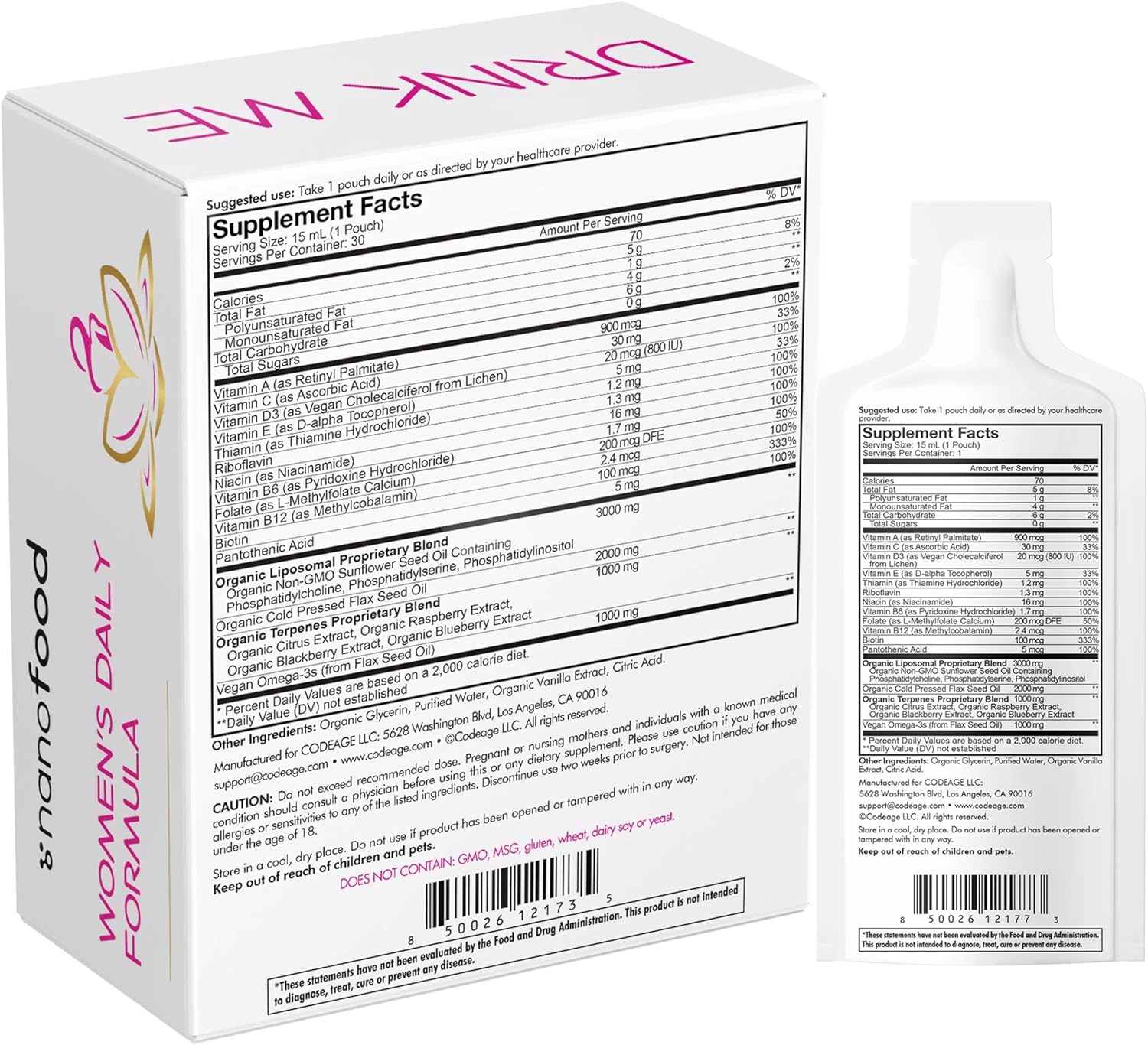 Drinkable Women’s Multivitamin in Sachet – 1 Pouch Daily: Codeage Nanofood Women’s Daily Vitamins pouch supplement provides vegan vitamins A, B, C, D3 & E with omega-3s, phospholipids, and organic fruit extracts in a delightful peach flavor.