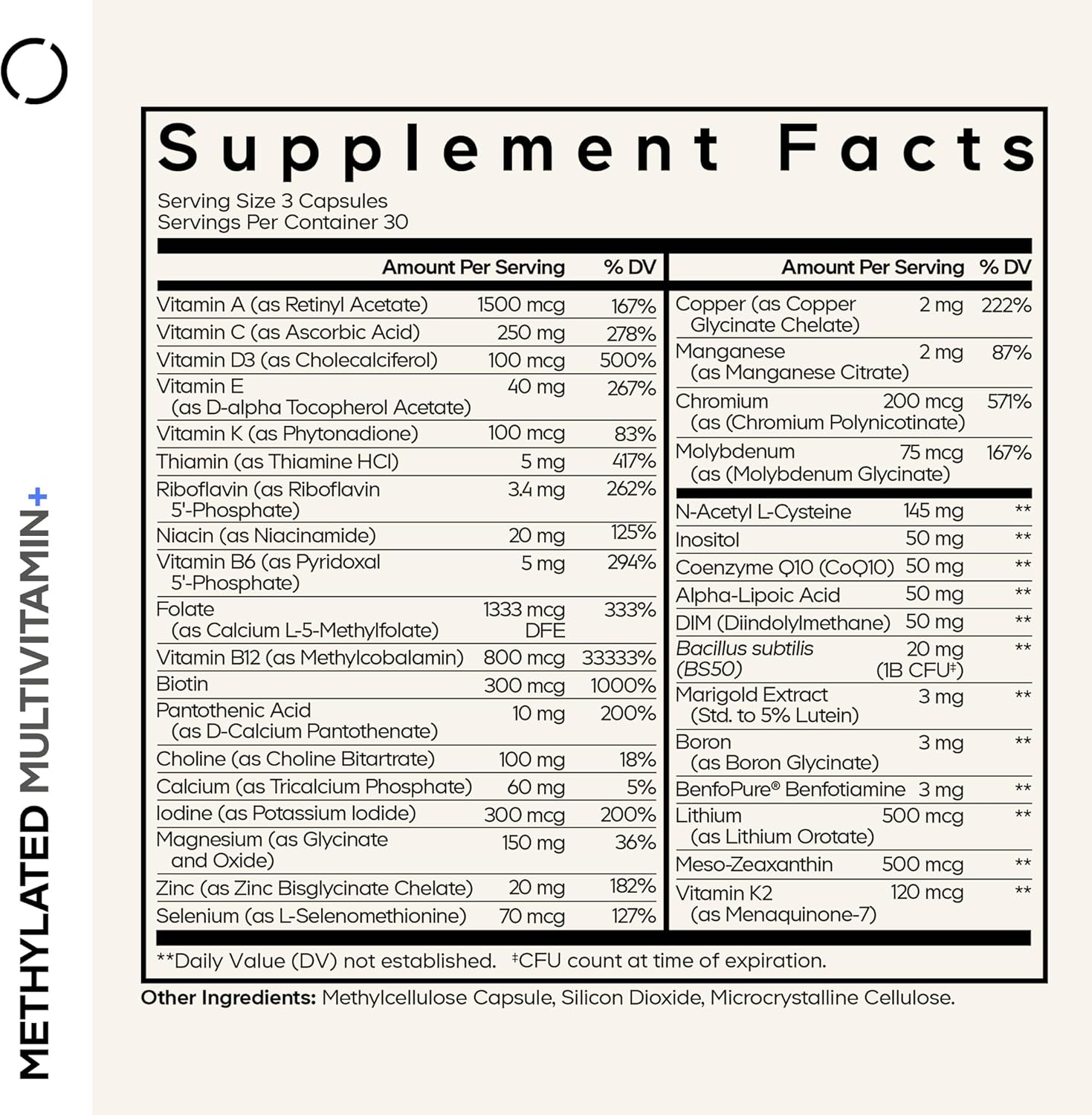Comprehensive Multivitamin Complex: Codeage Methylated Multivitamin+ combines essential vitamins like A, C, D3, E, K, and B-vitamins, including methylated B12 (Methylcobalamin) and L-Methylfolate.