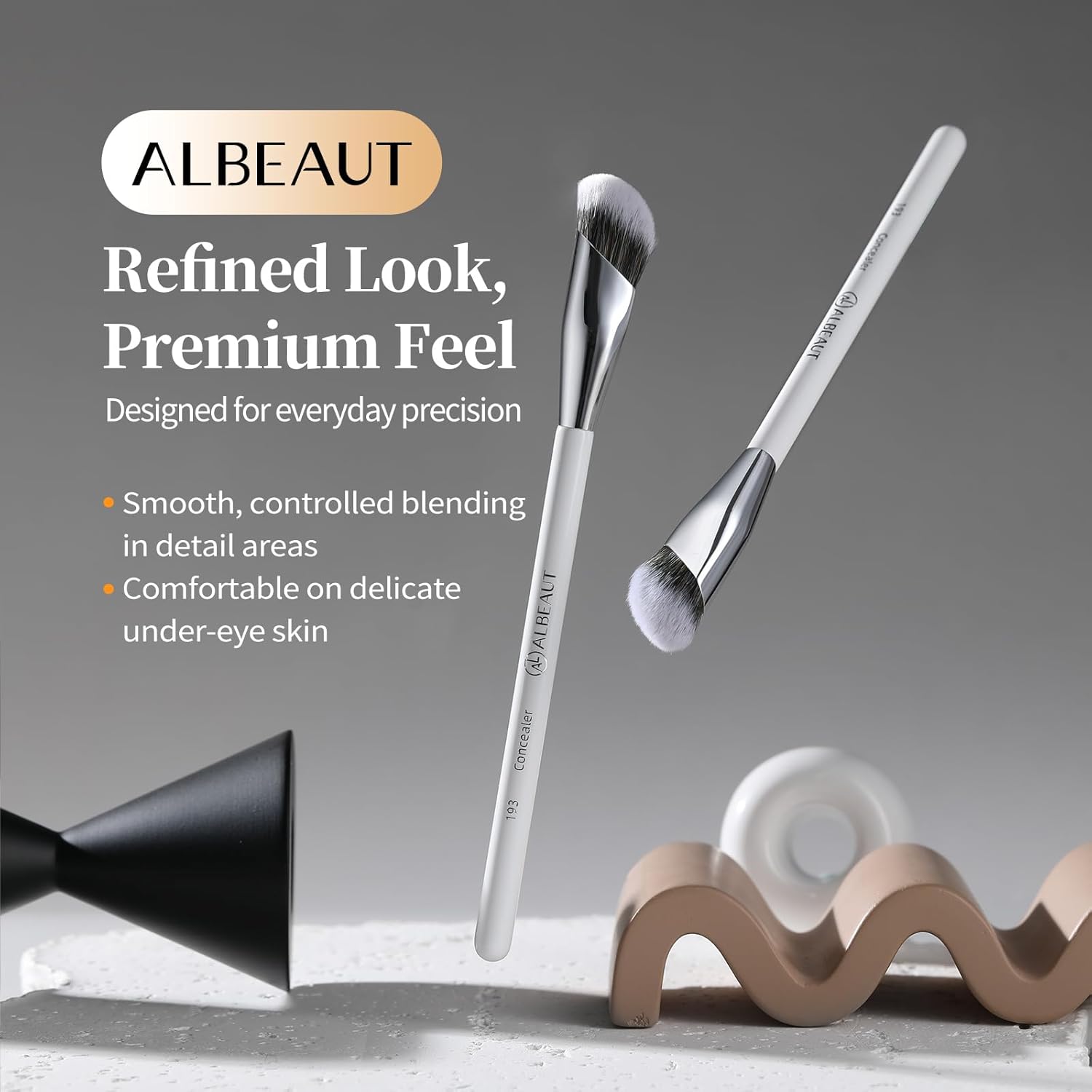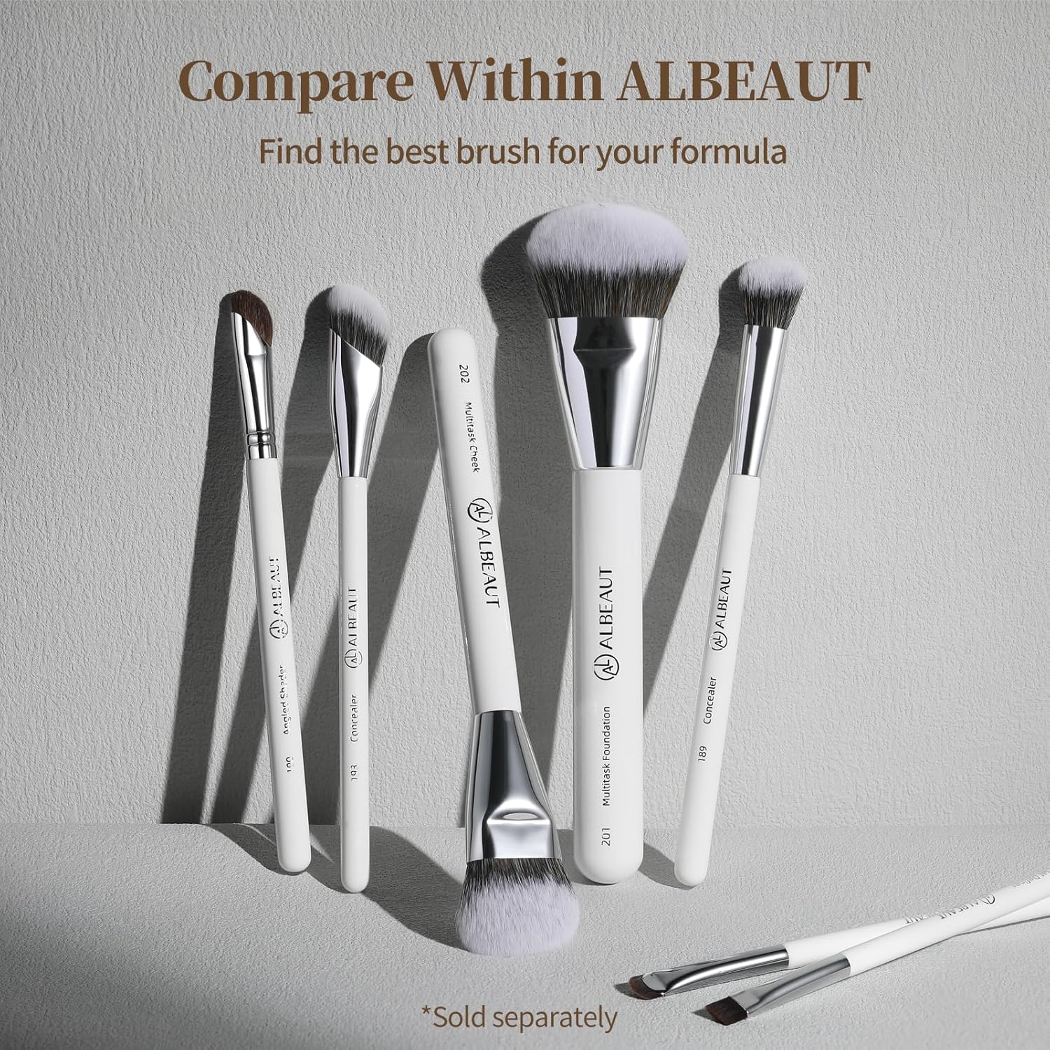 The ALBEAUT 195 Pro Blender is a precision eye brush created to enhance eye definition while keeping blends soft, clean, and controlled. The ALBEAUT 197 Micro Pencil is created for controlled, detailed application, allowing you to refine eye looks with precision while keeping edges soft and intentional. The Albeaut 202 multitask cheek brush is a versatile tool perfect for applying foundation, blush, and contour with ease. The angled design allows for precision in creating a flawless makeup look. This set includes the versatile ALBEAUT 201 Angled Foundation Brush and 189 Angled Concealer Brush. Perfectly paired, these brushes offer comprehensive coverage for both your foundation and concealer needs, ensuring a seamless and smooth finish. This brush set includes 2pcs our most popular an angled concealer brush 193 . The angled concealer makeup brush fits perfectly under eyes and other hard to reach small curves of the face,including contouring sculpting the nose for a seamless finish. The 193 is firmer and denser, ideal for cream concealers, while the 189 is densely packed yet airy, perfect for under-eye brightening with liquid powders. Together, they work with most concealers, making your process effortlessly flawless.