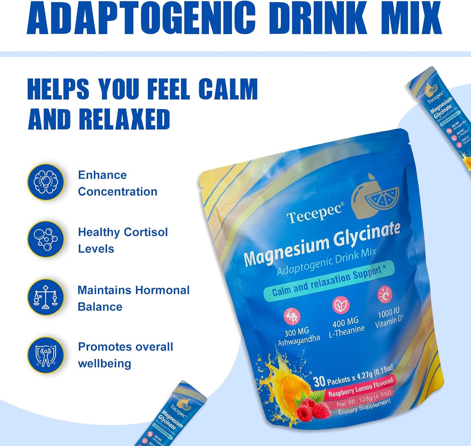 Support Calm and Relax: Tecepec Magnesium Glycinate Adaptogen Powdered Drink is a blend of L-Theanine and the nutrients of Ashwagandha and Vitamin D3, each of which is selected to help you have balanced, healthy and happy hormones, giving you a calming experience.
