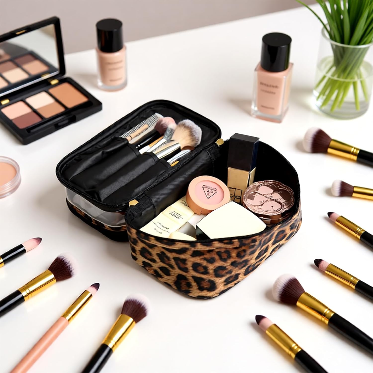 Double-layer Cosmetic Bag Makeup Bag Travel Makeup Bag Makeup Bags for Women Cosmetics Cases Portable Waterproof Foldable (Leopard)