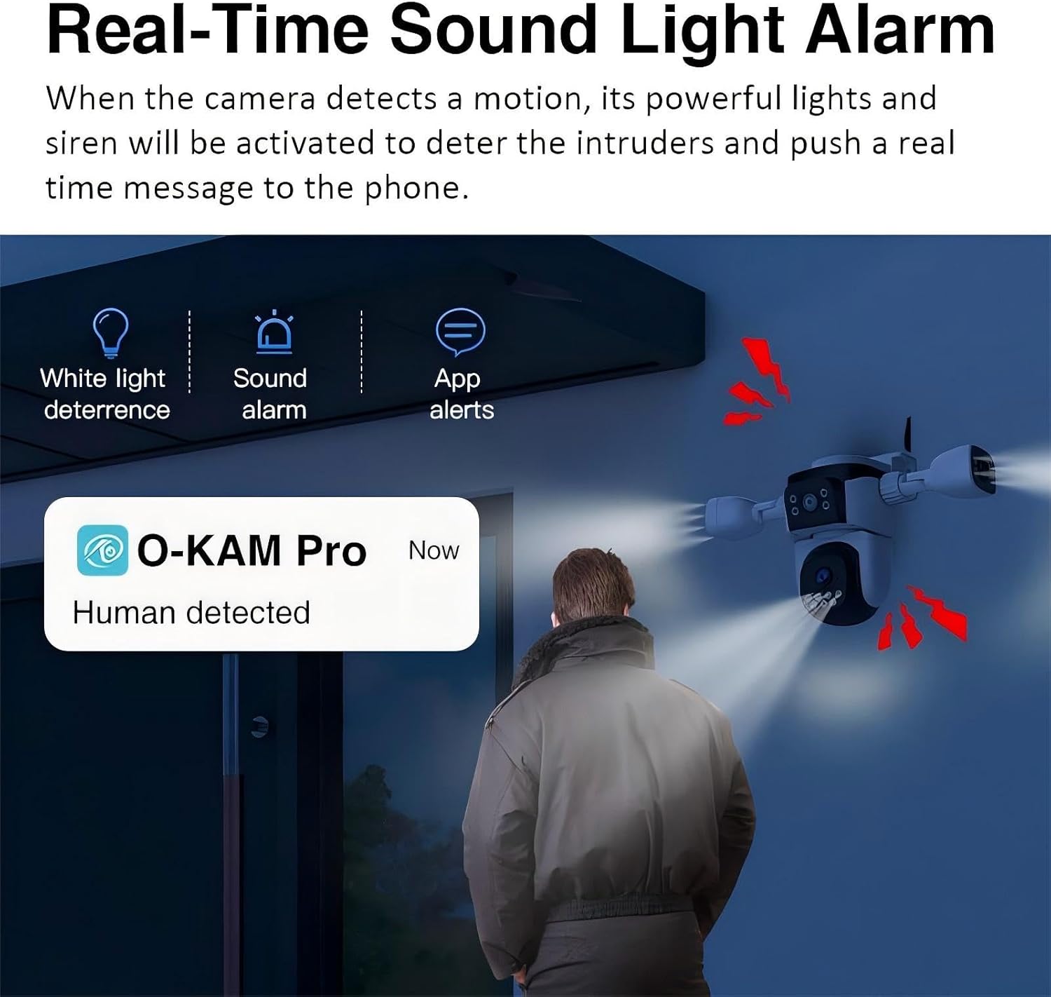 【Vivid Night Vision & Interactive Audio】This exterior PTZ camera, complete with infrared and warm light LEDs, offers color/IR night vision capabilities up to 60 feet. It maintains clear imaging even in pitch-black environments through its full-color night vision. The camera provides three different night vision modes for your selection. With its dual-lens design, it also includes a built-in speaker and microphone, enabling real-time interaction with visitors or the deterrence of intruders via the mobile app, from anywhere.