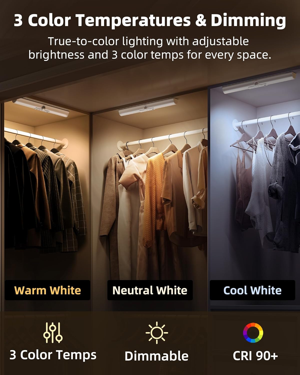 Customizable Lighting & High CRI: This LED light for closet provides 100 lumens of brightness with stepless dimming from 10% to 100%. You can set the perfect light for any need. Choose warm white (3000K) for soft night light use, natural white (4500K) for outfit matching, or cool white (6500K) for clear visibility. High 90+ CRI ensures true, vibrant colors.