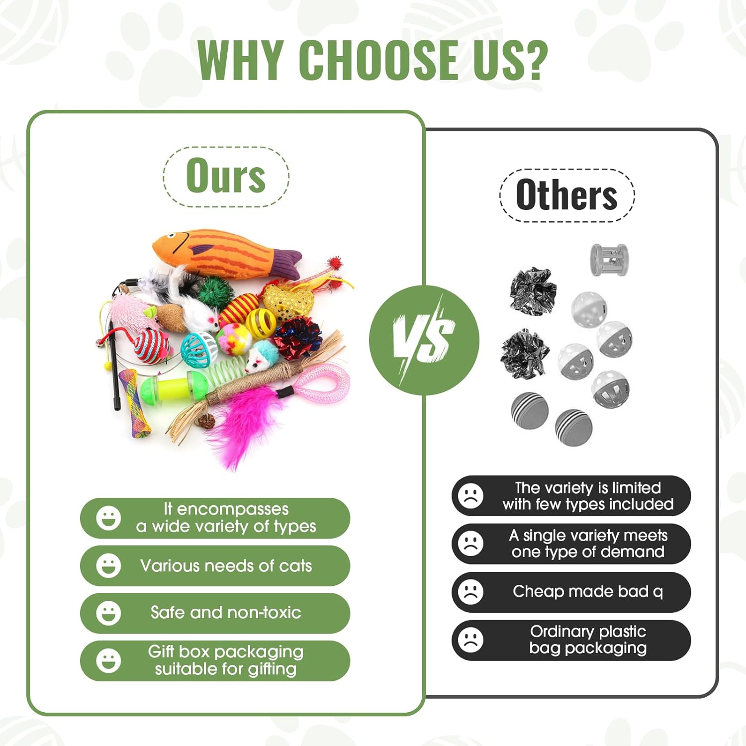 Warm Reminder: This is a randomly assembled product bundle. We will periodically update the toys included, so the styles and colors of the toys may differ from the pictures. It contains 20 different toys, including Cat wand toy, cat ball toys, catnip mice, rattle toys, feather toys, and more.