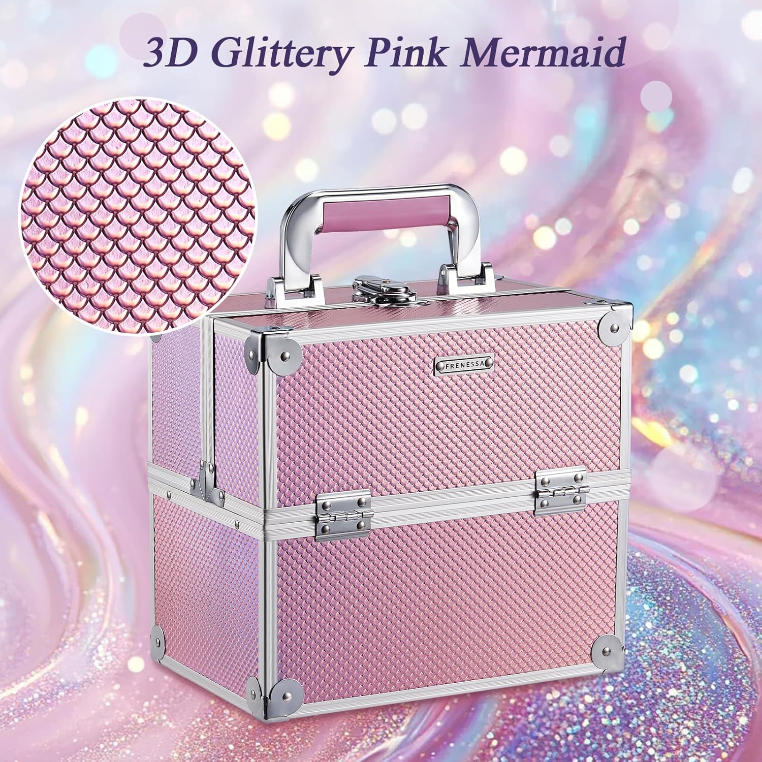 Mermaid Pink Makeup Case: This sturdy pink makeup case organizes and carries cosmetics effortlessly. Its portable 9.84″x7.08″x9.33″ size suits travel and daily use for all skill levels. Durable ABS aluminum construction with metal reinforced corners protects contents from impact, extending lifespan. Lightweight yet exceptionally durable, this case balances portability and lasting performance for on-the-go use. The waterproof glitter pink surface protects outdoor cosmetics from environmental factors and shimmers with light, changing hue from different angles.