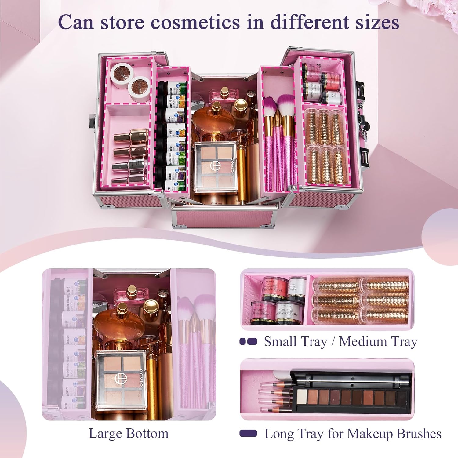 Spacious & Practical Train Case: Storage is flexible to fit in various sizes of cosmetic products such as your toiletries, nail polish, essential oils, jewelrys, paint brush, crafting tools. There is large bottom space for the palette and even travel-size bottles.