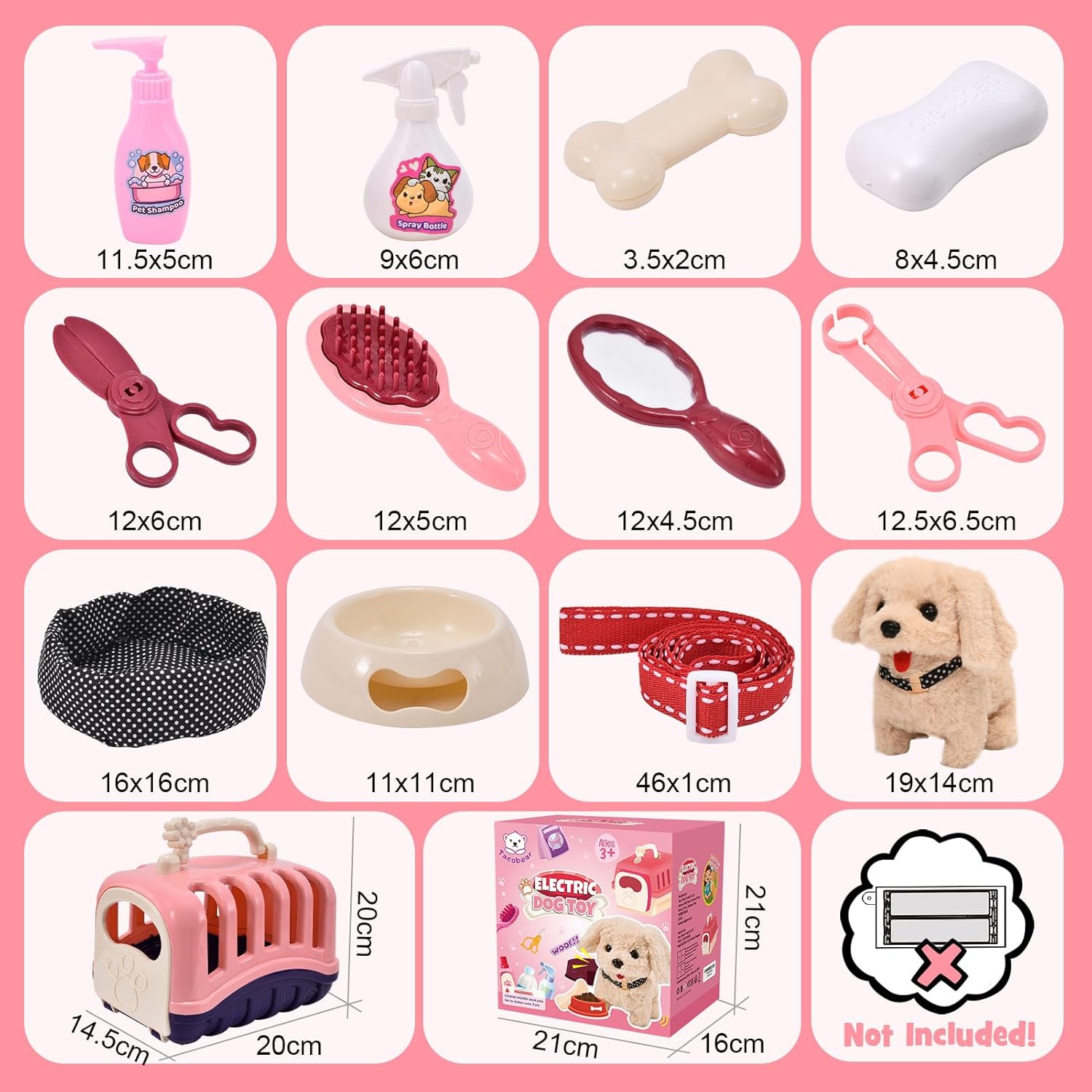 【Super Deluxe Dog Toys for Kids】—This pretend play toy set comes with abundant accessories, including electric stuffed dog(batteries not included), dog basin, dog leash, bone, dog carrier, dog kennel, care solution, shampoo, soap, comb, mirror and etc. Children would like to spend more time to observe and play with these toys dog, which will bring your kids hours of fun