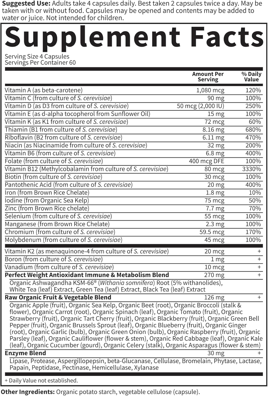 RAW MULTIVITAMIN: Vegetarian, gluten free, and dairy free whole food multivitamin, with NO binders or fillers