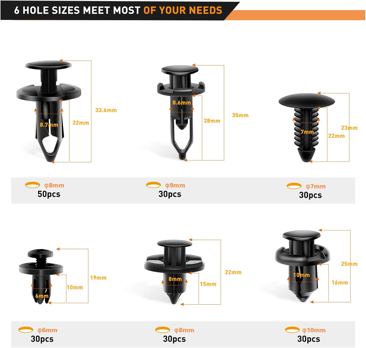 Package Include:Includes 30 pcs 6mm Clips ,30 pcs 7mm Clips, 30 pcs 8mm Clips(YT:1362), 50 pcs 8mm Push Clips(YT:3143), 30 pcs 9mm Clips, 30 pcs 10mm Clips.