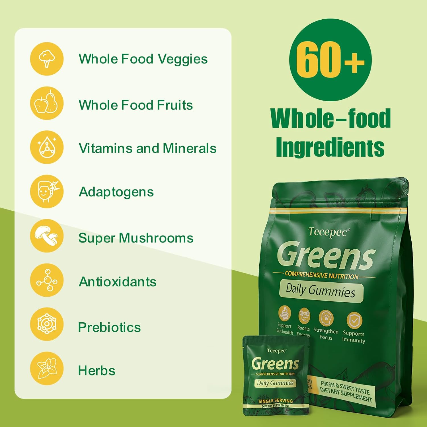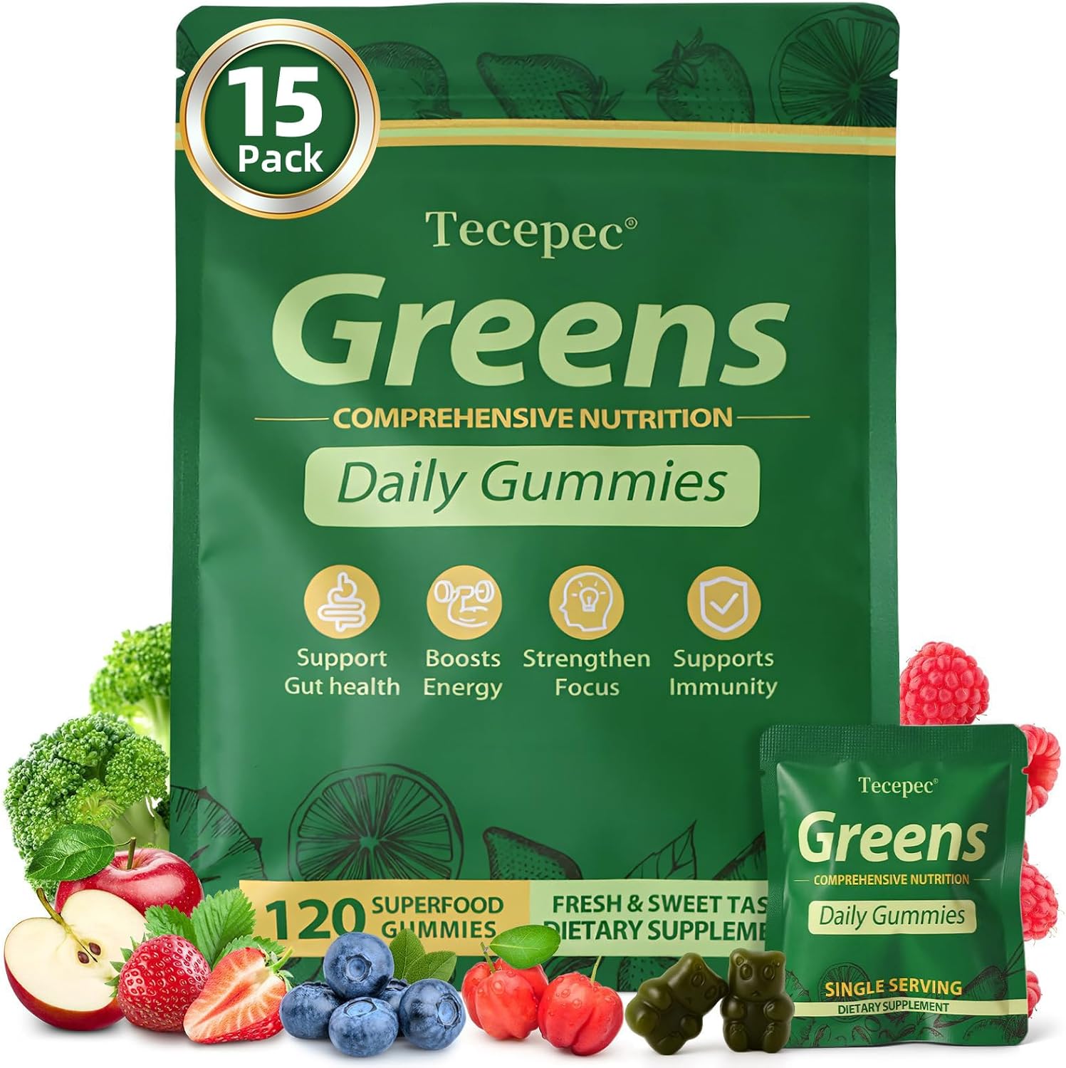 Simply delicious: Green Gummies come in convenient, individually packaged packets, each containing delicious gummy bears. Enjoy the delicious taste and benefits of our comprehensive nutritional gummies anytime, anywhere. 120 gummies, eight per day, are convenient and mess-free for on-the-go consumption. Experience the benefits of whole greens, fruits, and antioxidants in every bite.