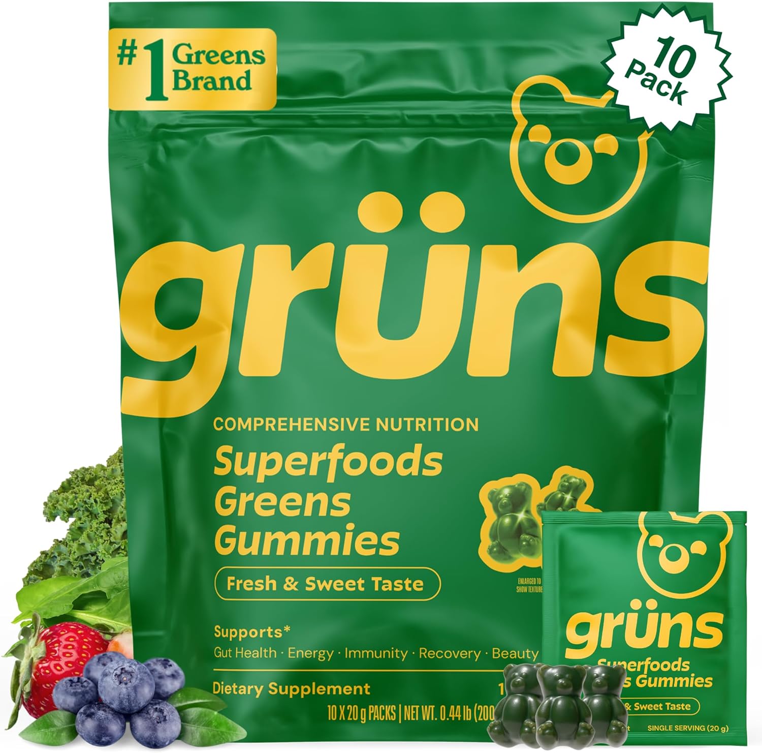 NO MESS, NO STRESS: Grüns is thoughtfully formulated to be a delicious and seamless addition to your daily routine with our convenient individual snack packs. Each pack contains tasty gummy bears so there’s no more cobbling together handfuls of supplements. Enjoy the delightful flavor and benefits of our comprehensive nutrition gummies anytime, anywhere. 10 individual packet, making it the ideal nutritional snack on the go! 80 gummies total.