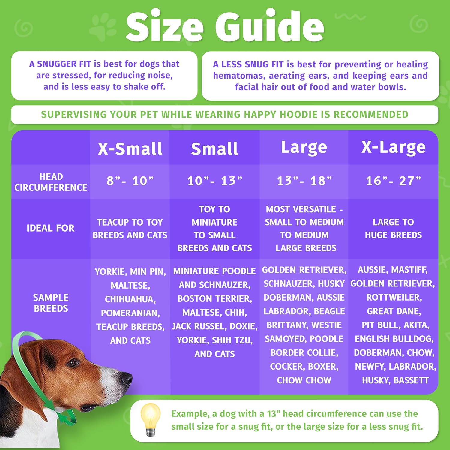 If at least 4 fingers fit comfortably between your pet’s head and Happy Hoodie, it’s not too tight. For dogs with overly thick necks, fold any excess fabric on the neck onto its head or use your pet’s neck measurement for sizing to aid with comfort.