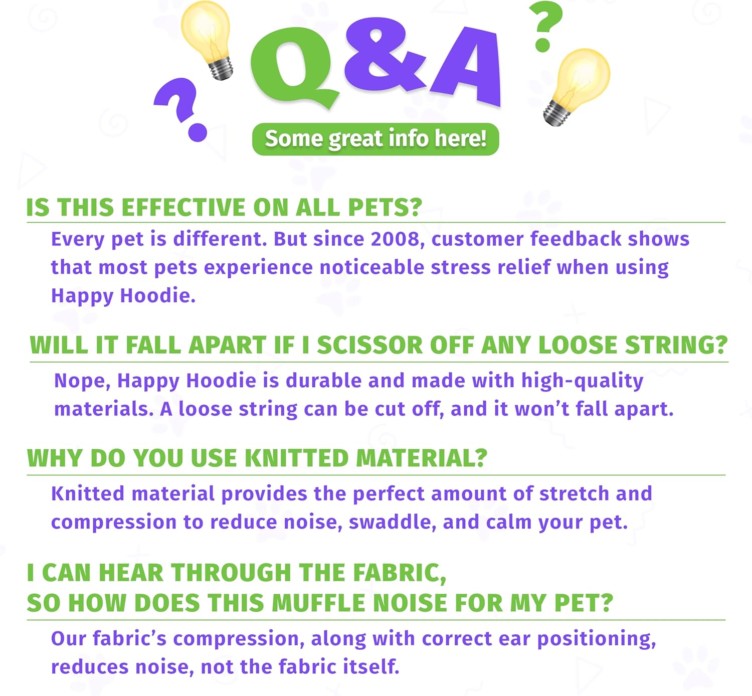 𝗛𝗢𝗪 𝗧𝗢 𝗥𝗘𝗗𝗨𝗖𝗘 𝗡𝗢𝗜𝗦𝗘. It is important to place the ears DOWN over the ear canals so the ear canals are NOT exposed, then secure them in place w/ Happy Hoodie. Noise reduction is achieved by Happy Hoodie’s gentle compression closing off the ear canal. IF YOU THINK IT’S TOO TIGHT, PLEASE KNOW SNUGNESS IS NECESSARY. IF YOUR 4 FINGERS FIT UNDER IT, IT’S NOT TOO TIGHT (IT’S SO STRETCHY!). Pets appreciate it most when used ONLY during a stressful situation. PLEASE REFER TO SIZE GUIDE BEFORE PURCHASE.