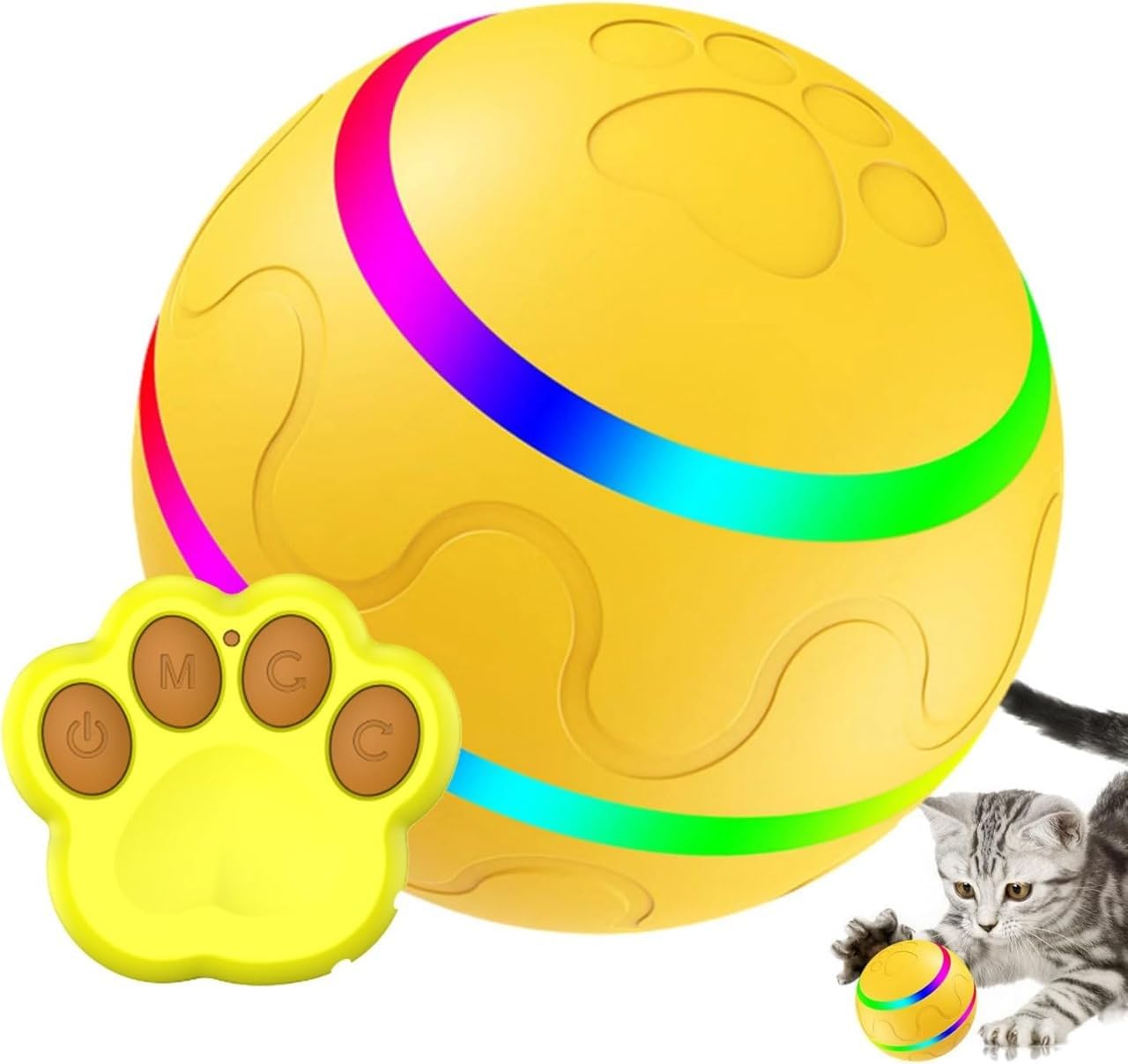 Transform playtime into an exciting adventure with this innovative interactive pet ball toy featuring a unique paw-shaped remote controller. The vibrant yellow self-rolling ball keeps your furry friend engaged with its automatic movement patterns and built-in LED lights. Perfect for both cats and dogs, this smart toy helps prevent boredom and encourages active play, even when you’re busy. The ball’s durable construction withstands enthusiastic play sessions, while the USB rechargeable feature ensures long-lasting entertainment. The convenient remote control lets you adjust the ball’s movement, making it an ideal choice for pets of all activity levels and ages. Whether your pet loves to chase, pounce, or simply watch rolling objects, this interactive toy provides hours of engaging entertainment while helping maintain their physical and mental well-being.