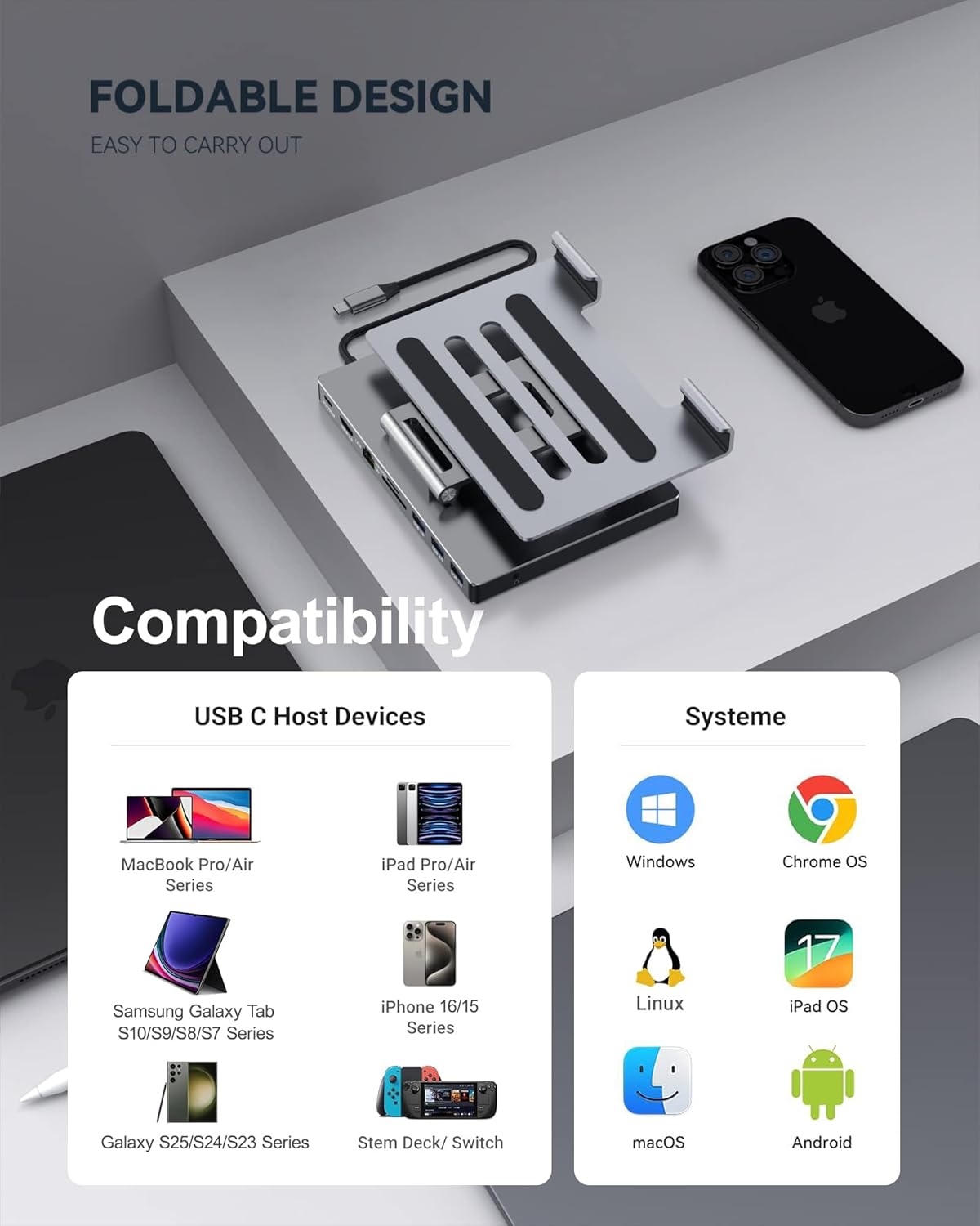 Folding design & compact: this docking station can be folded and is very convenient to carry