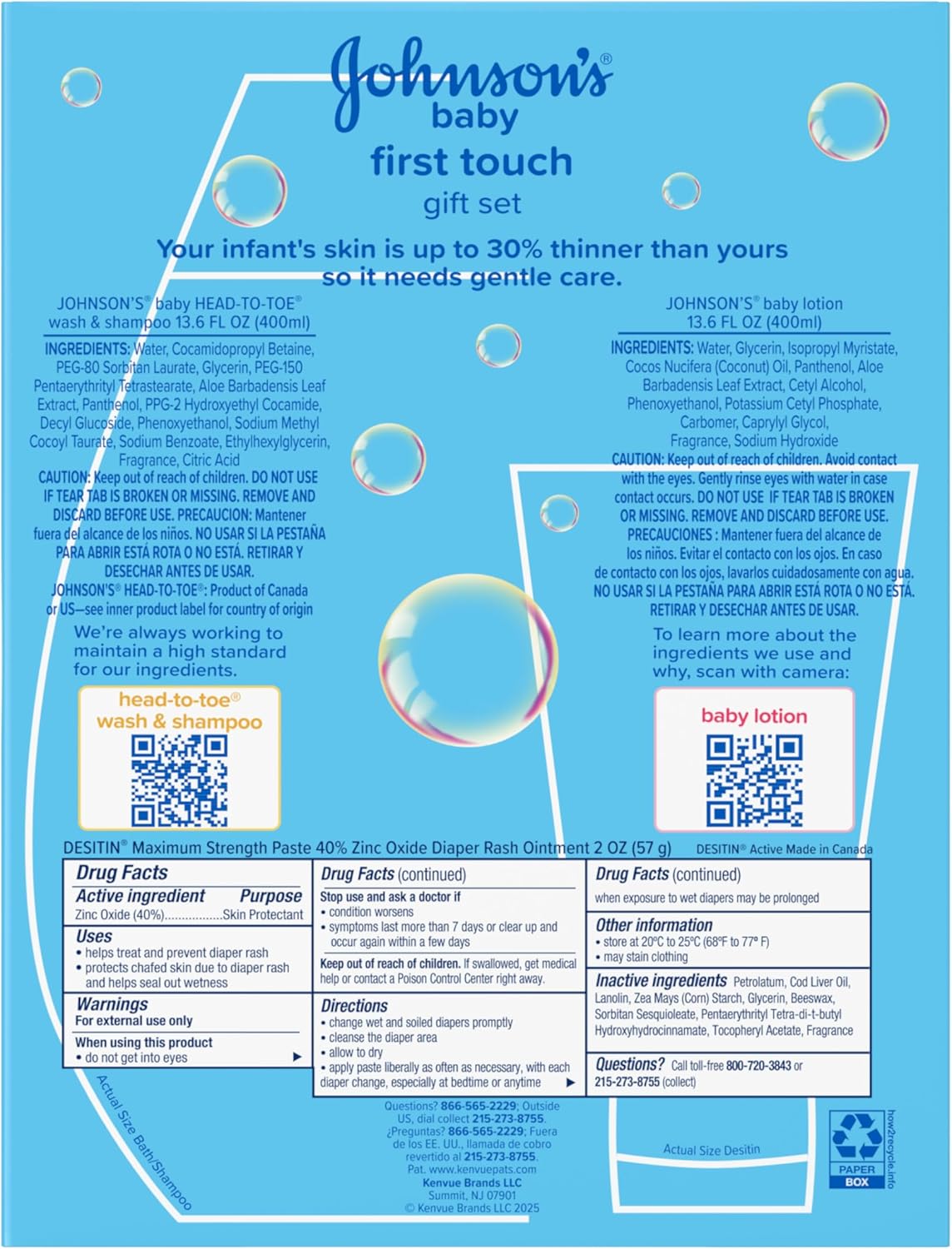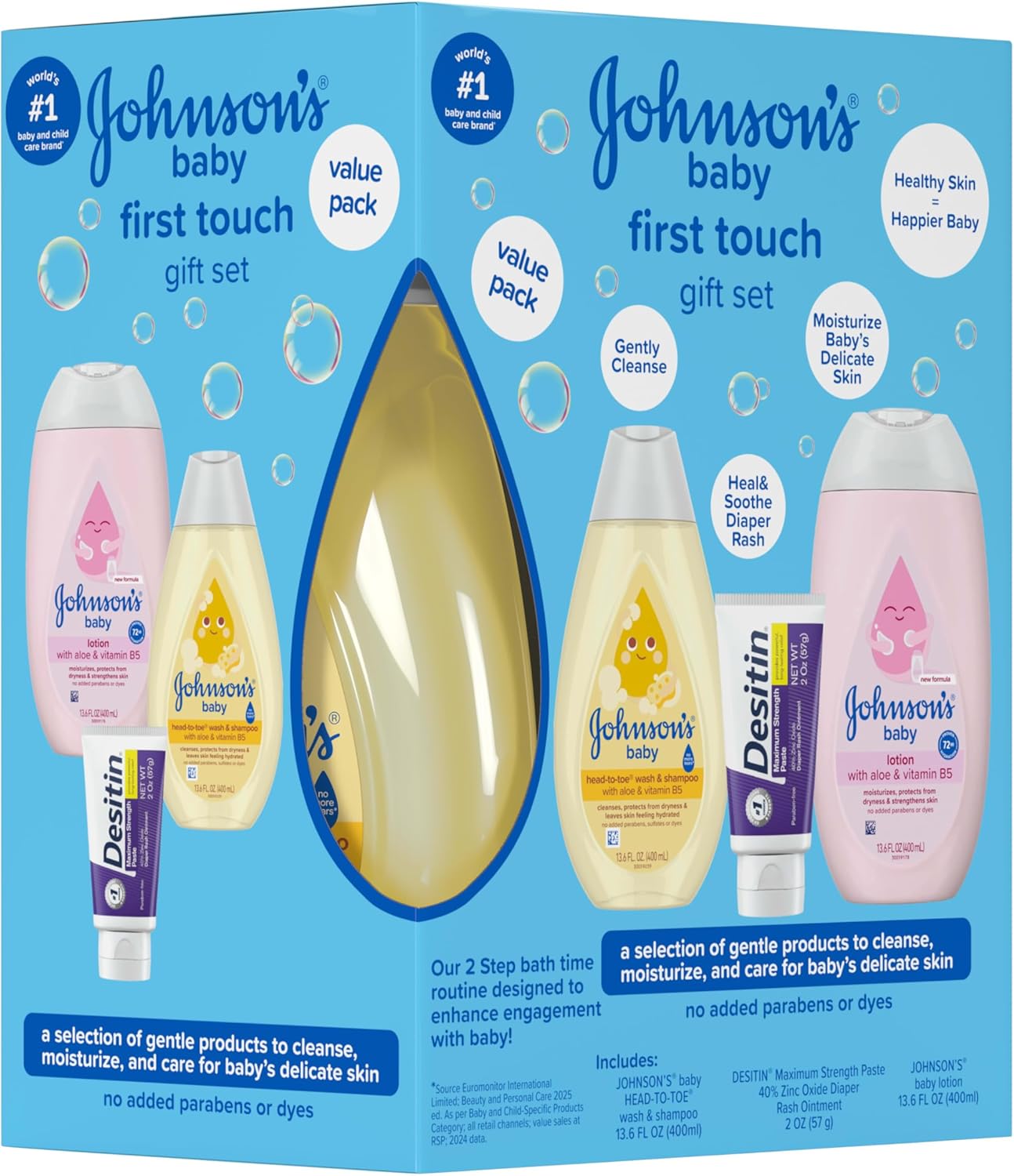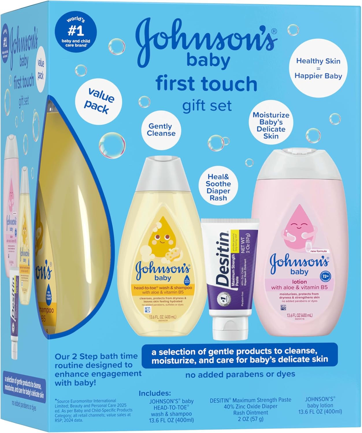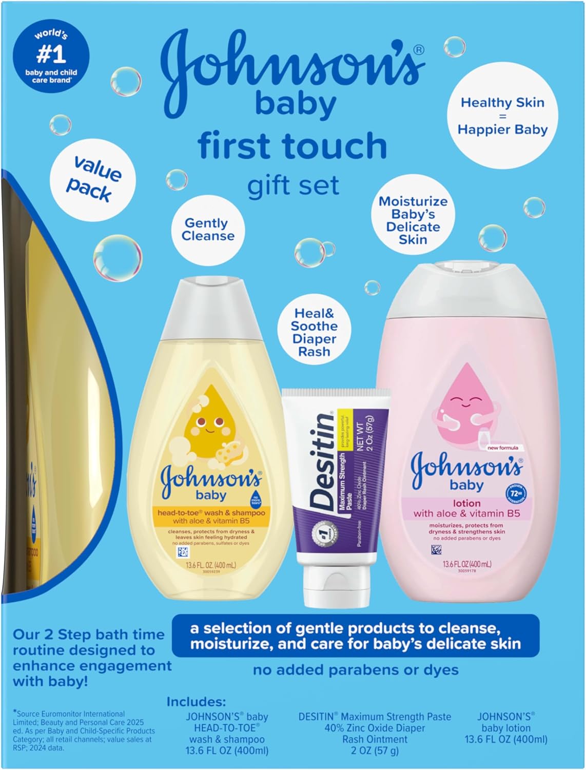 Care for your baby’s delicate skin with the First Touch Gift Set from Johnson’s Baby, the world’s #1 baby & childcare brand.* This set makes the perfect baby shower gift for new or expecting parents. The Head-To-Toe Baby Wash & Shampoo gently cleanses baby’s skin and hair without drying and is as gentle as pure water. The Moisturizing Baby Lotion with soothing aloe hydrates & nourishes for 24 hours to help maintain baby’s healthy skin. The Maximum Strength Diaper Rash Paste with 40% zinc oxide from Desitin, the #1 choice of pediatricians, works on contact to treat & help prevent diaper rash discomfort by sealing out wetness. This baby set features formulas that are gentle & free of dyes, parabens & sulfates. Together, these trusted baby skincare products work to cleanse, moisturize, and protect baby’s skin. * Source Euromonitor International Limited; Beauty & Personal Care 2024 ed. as per Baby & Child-Specific Products category; all retail channels; value sales at RSP; 2023 data.