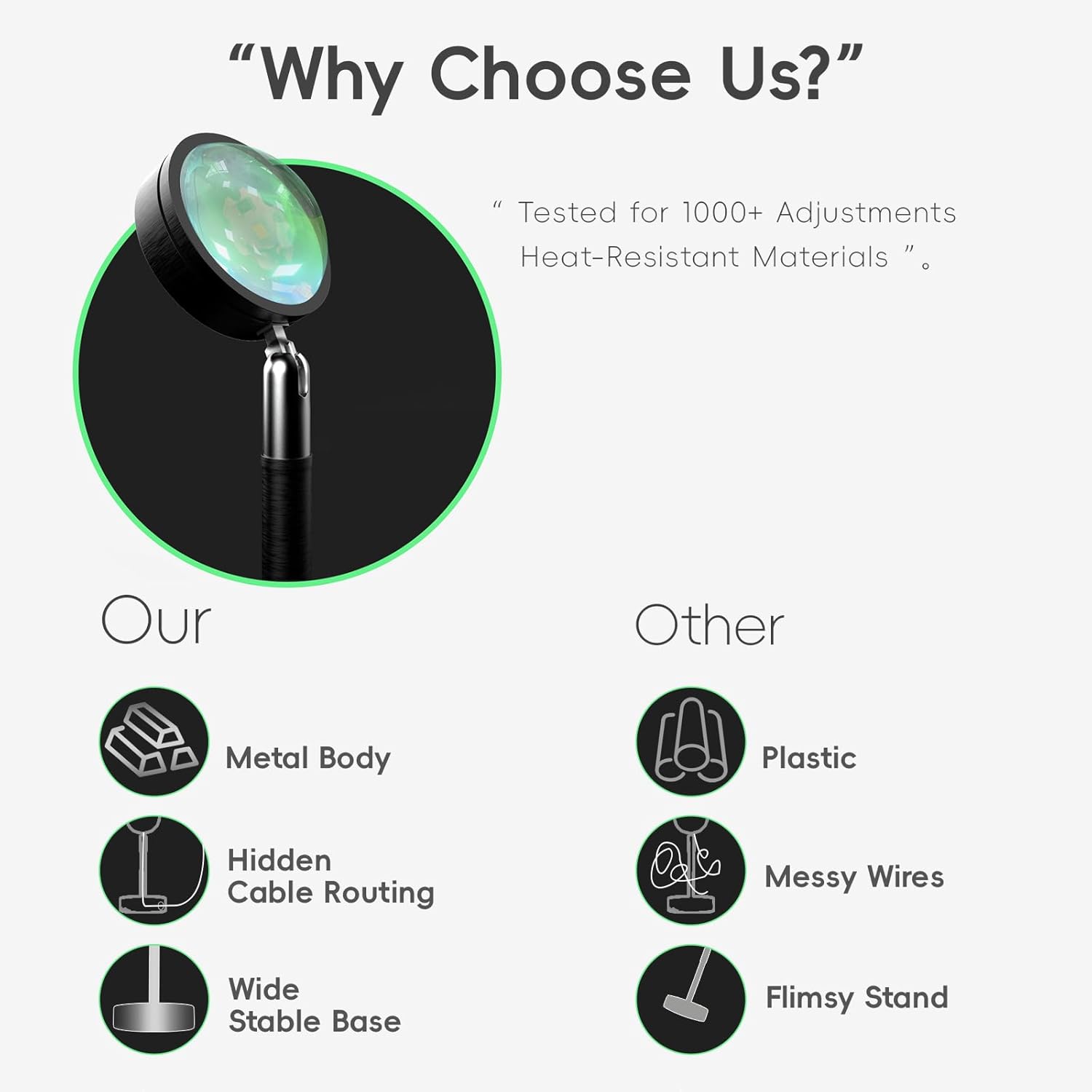 Sturdy & Flexible Lighting for Every Space:Engineered with premium aluminum alloy joints and heat-resistant materials, our sunset lamp projector is designed for long-lasting durability. Easily rotate the lamp head 180° to cast warm, ambient light on walls, ceilings, or floors—perfect for setting the mood in bedrooms, offices, or photo studios. The reinforced base ensures stability, even during adjustments, while the optimized heat dissipation system maintains a safe surface temperature during extended use. A reliable choice for daily ambiance or creative lighting projects.