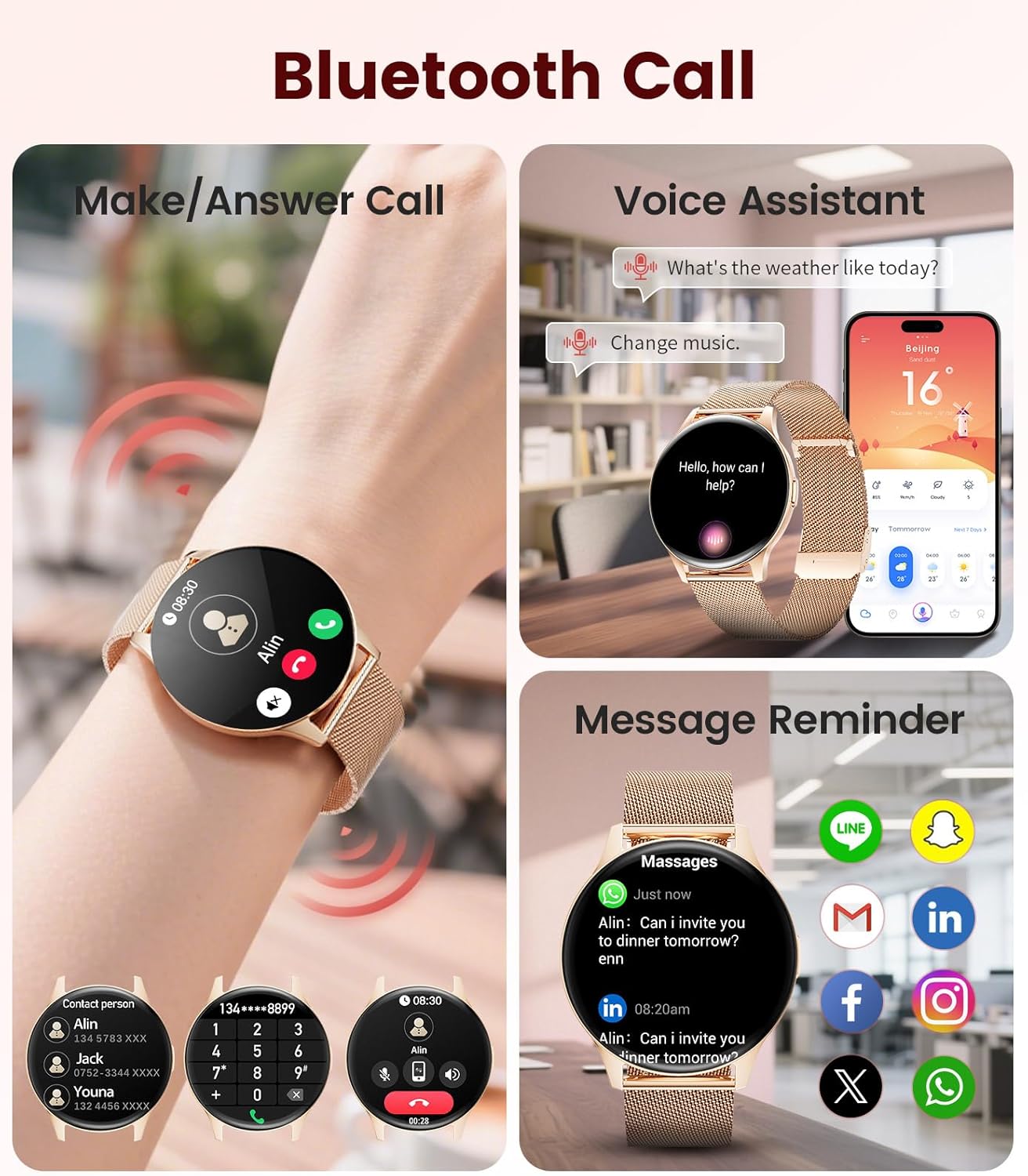 24/7 Assistant & Everyday Companion: More than just a fitness tracker, this sport watches for women is your personal daily assistant. Receive call, message, and app notifications right on your wrist. Smart reminders, alarms, and weather updates help keep your day organized and stress-free. With a single charge, it reliably supports you through work, leisure, and workouts—a smart companion that truly enhances your everyday life.