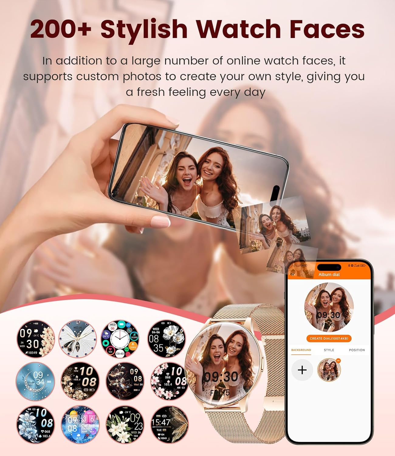 HD AMOLED Touchscreen & 200+ Watch Faces:This smart watches women features a stunning 1.43″ AMOLED touchscreen with sharp clarity, vibrant colors, and smooth responsiveness—even in direct sunlight. With over 200 customizable watch faces, you can effortlessly match your watch to your mood or outfit, whether modern, classic, or playful. You can even upload your own photos to create a truly personal look—where individuality meets fashion in perfect harmony(Note: The link includes tutorial videos to help you use the watch effectively.).