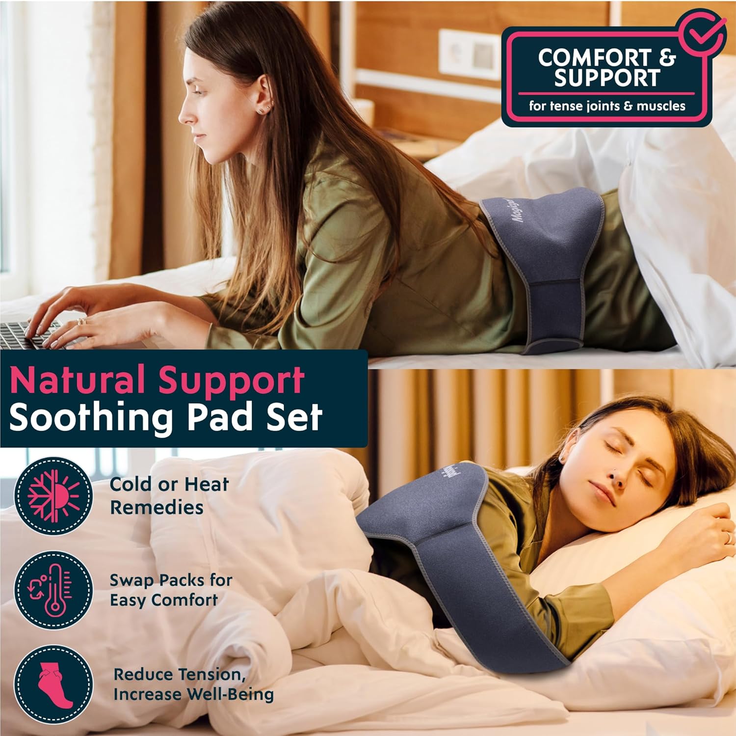 Back Support: The Magic Gel pad & strap provide cooling and heating compression for the upper and lower back, supporting recovery. It’s soft and flexible design, even when frozen, makes it an ideal choice.