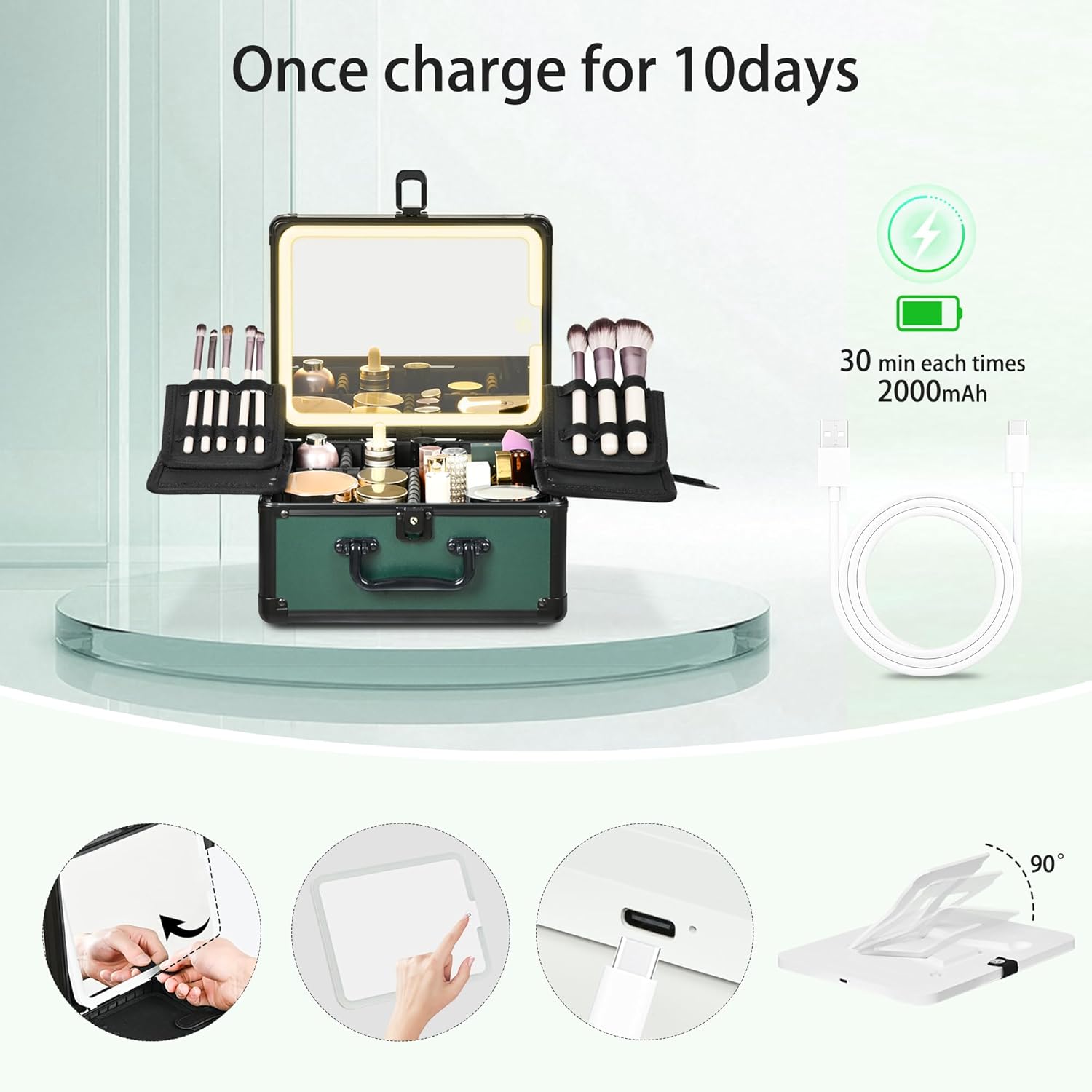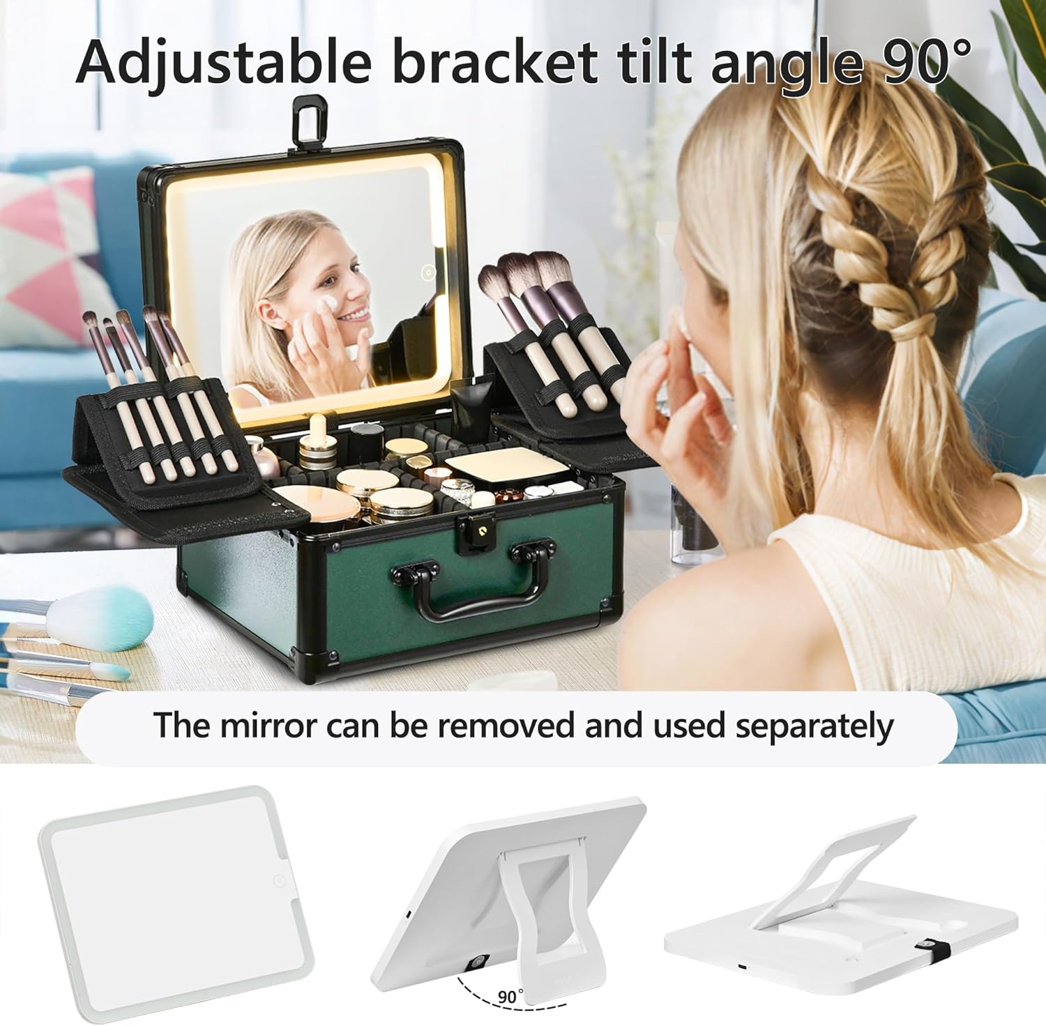 Makeup Case with Lighted Mirror, Makeup Box Organizer with Detachable LED Mirror, Travel Makeup Train Case, Waterproof Cosmetic Organizer, Standing Makeup Brush Holder, Gift, Black Green