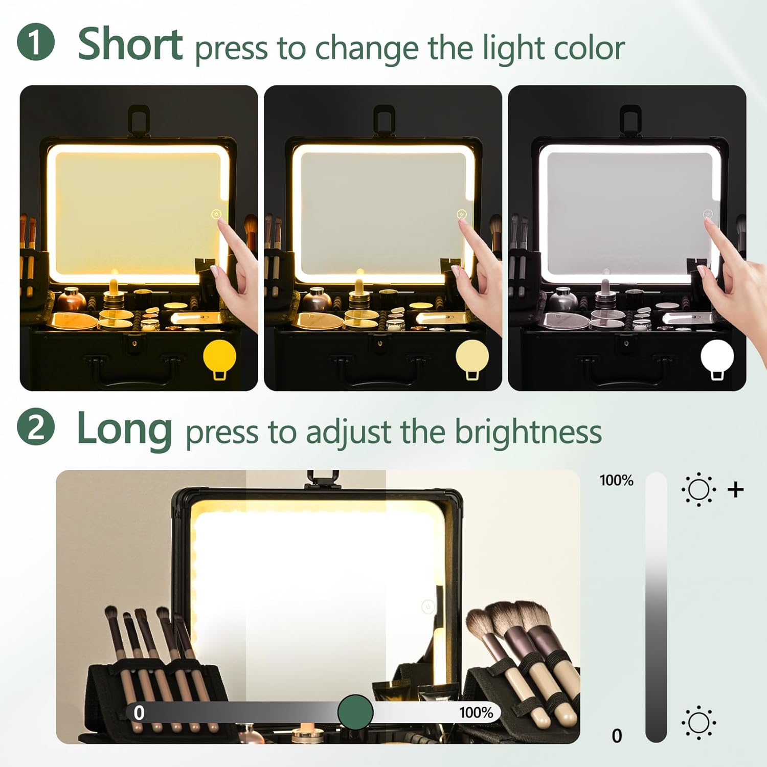 【Adjustable Lighting】The mirror offers three lighting modes (cool, warm, and natural light) with adjustable brightness, simulating various lighting scenarios for precise makeup application.