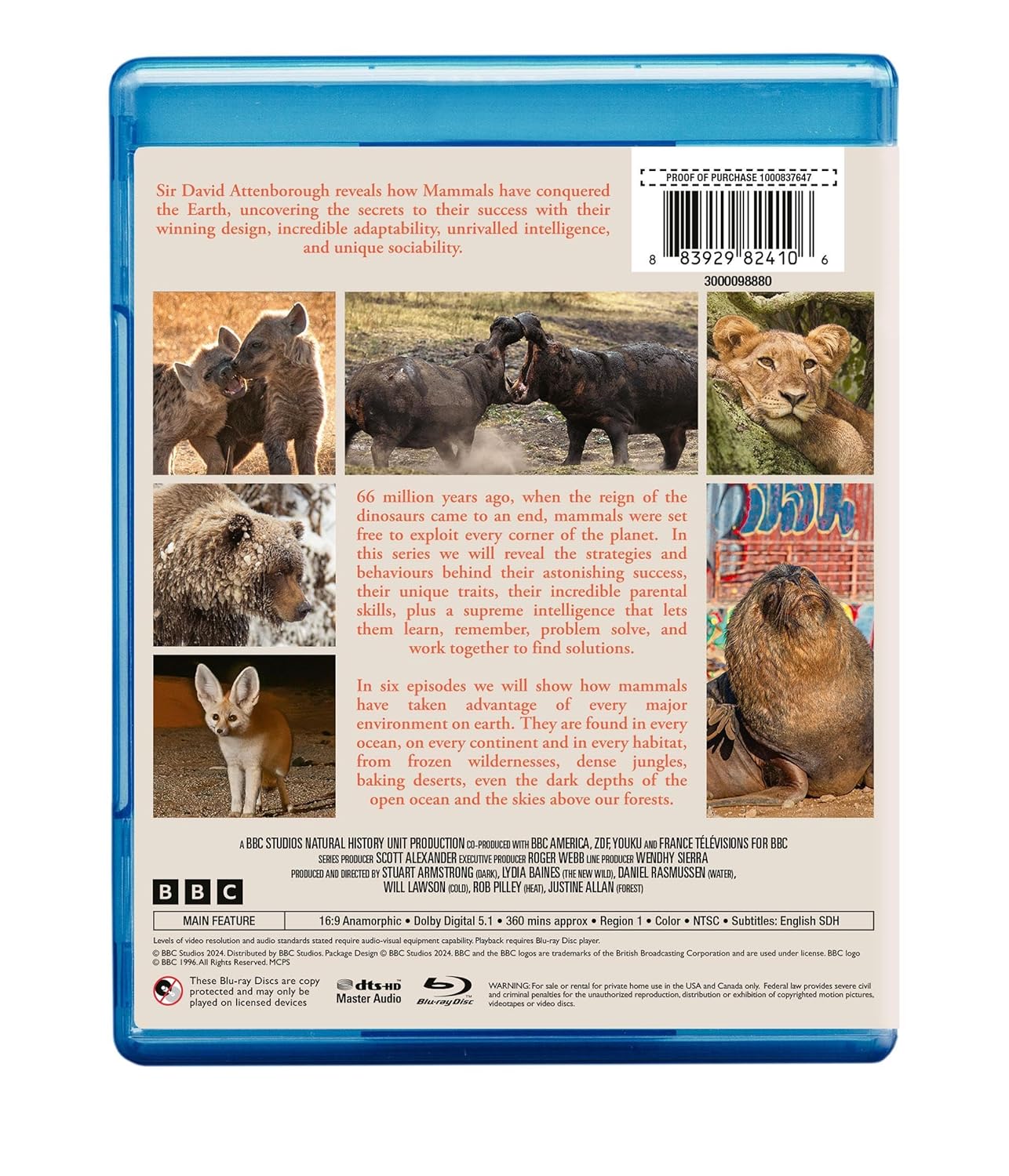 This contemporary and unfiltered series offers fascinating insights into the most successful animal group ever, from the tiny Etruscan shrew to the giant blue whale. Mammals, the most loved group of all animals, are found on every continent and in every ocean, from the frozen wildernesses to the densest jungles, in the hottest deserts and the darkest depths. Discover the secrets to their success – their winning design, incredible adaptability, unrivalled intelligence and unique sociability. The series also highlights many of the challenges facing mammals in a rapidly changing world and how they endeavour to overcome them.