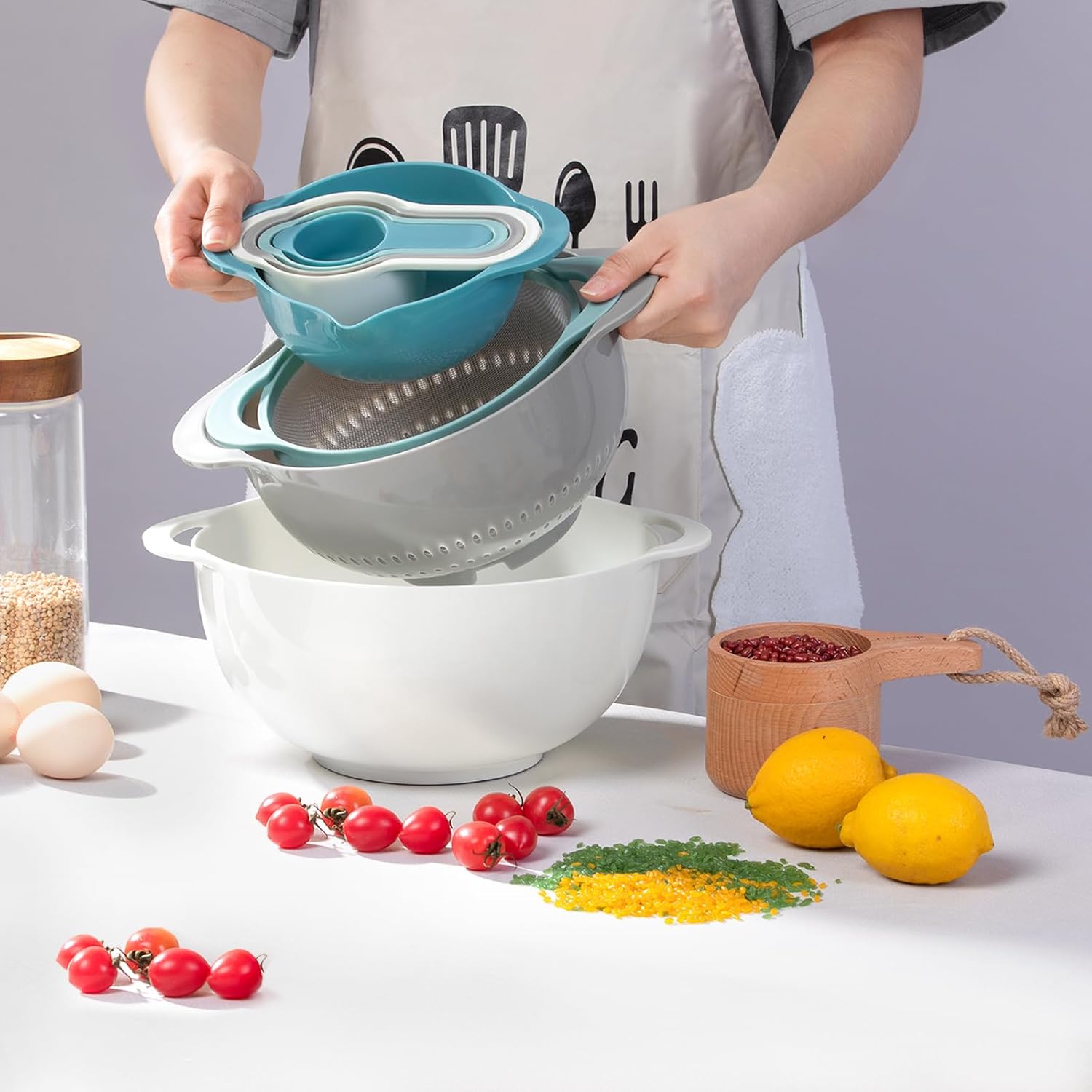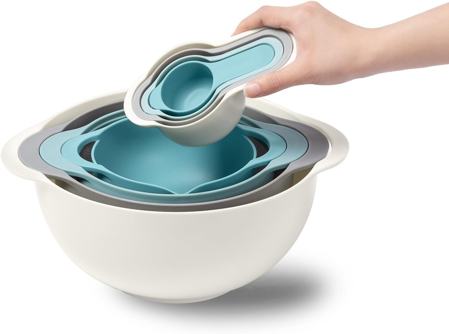 Esie Houzie mixing bowl sets is a set of versatile nesting bowl sets, included 2 mixing bowl, 1 colander, 1 sieve, 4 measuring cups, and 5 kitchen gadgets, These bowls and gadgets nest neatly inside each other to save you tons of space on kitchen counters, in cupboards and cabinets, or in the pantry! If you just start your cooking journey, if you are full of confusion and frustration as you begin to search for the best cookware and essential kitchen tools for minimalist cooks, come to have a try.