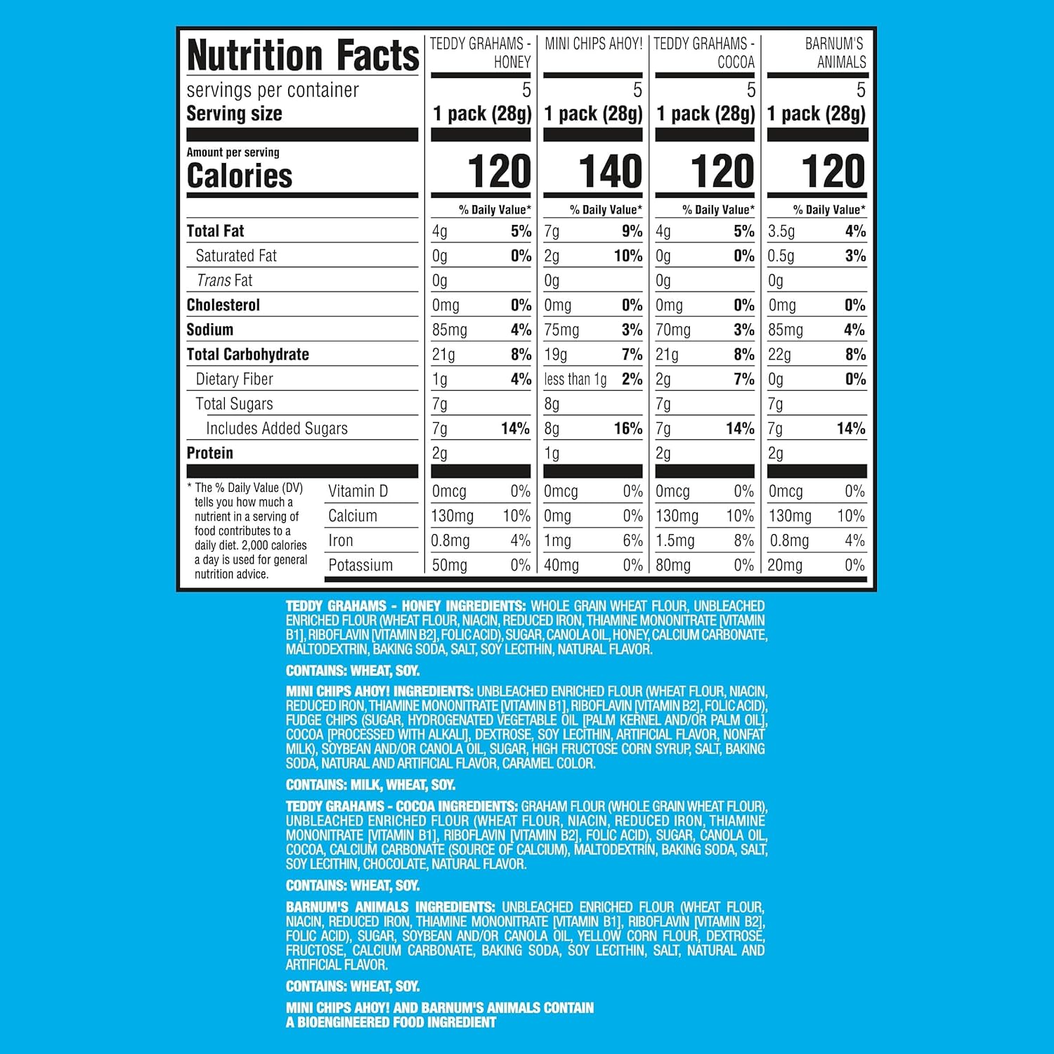 This Nabisco Fun Shapes Variety Pack includes Barnum’s Animal Crackers, mini CHIPS AHOY! cookies and Teddy Grahams graham snacks in both honey and chocolate for easy, grab-and-go nibbling. These snack packs have all the classic snack flavors, perfect for a simple treat or afternoon munchies. Barnum’s Animal Crackers provide satisfying sweetness, and CHIPS AHOY! mini chocolate chip cookies deliver the same great flavor in a bite-size snack. Two flavors of Teddy Grahams give you the classic taste of honey graham crackers and chocolate graham crackers for delicious sweet snacks. Make your lunch special with these yummy lunch snacks, or reach for one whenever you want to satisfy your sweet tooth at work or as an after school snack. This snack box includes 20 individually packaged cookie snack packs on the go for easy storage and convenient transport.