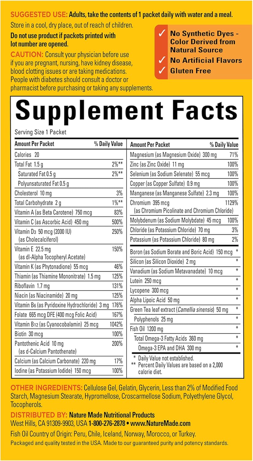 Nature Made Daily Diabetes Pack provides scientifically formulated nutritional support for people with prediabetes and diabetes. Sourced from high-quality ingredients, this gluten free diabetes nutritional supplement has no synthetic dyes and no artificial flavors. Each Nature Made Diabetes Health Pack of diabetes nutritional supplements contains a comprehensive combination of key vitamins, minerals and other dietary supplements, including a Multivitamin, Fish Oil with Vitamin D3, Magnesium, Vitamin C, Alpha Lipoic Acid, and Chromium. Chromium is necessary for carbohydrate metabolism and utilization and helps support healthy glucose metabolism. Adults take the contents of one dietary supplement pack daily with water and a meal. Nature Made supplements are quality you can trust.