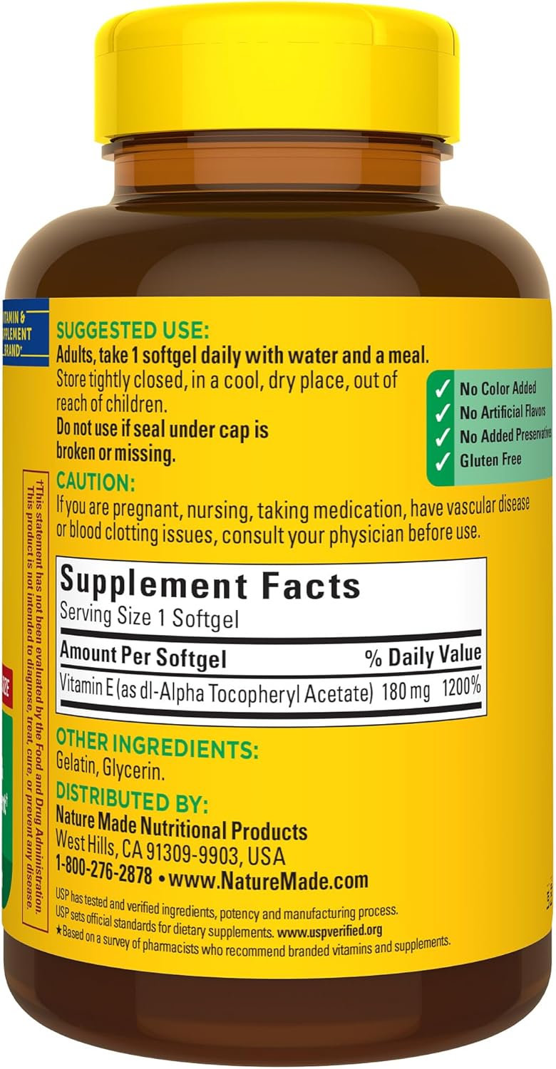 Nature Made Vitamin E 400 IU (180 mg) is an antioxidant supplement that provides Vitamin E, an essential nutrient that helps neutralize free radicals in the body. This Vitamin E supplement also supports immune health. Sourced from high-quality ingredients, these Nature Made Vitamin E 400IU (180 mg) softgels are gluten free and contain no color added, no artificial flavors and no added preservatives. This Vitamin E Nature Made dietary supplement is the dl-Alpha form of Vitamin E, which supports the body’s natural immune defenses. Adults, take one 400 IU Vitamin E softgel daily with water and a meal. Nature Made supplements are quality you can trust. USP has tested and verified ingredients, potency and manufacturing process. USP sets official standards for dietary supplements. Visit the USP verified website for more information. *Based on a survey of pharmacists who recommend branded vitamins and supplements.