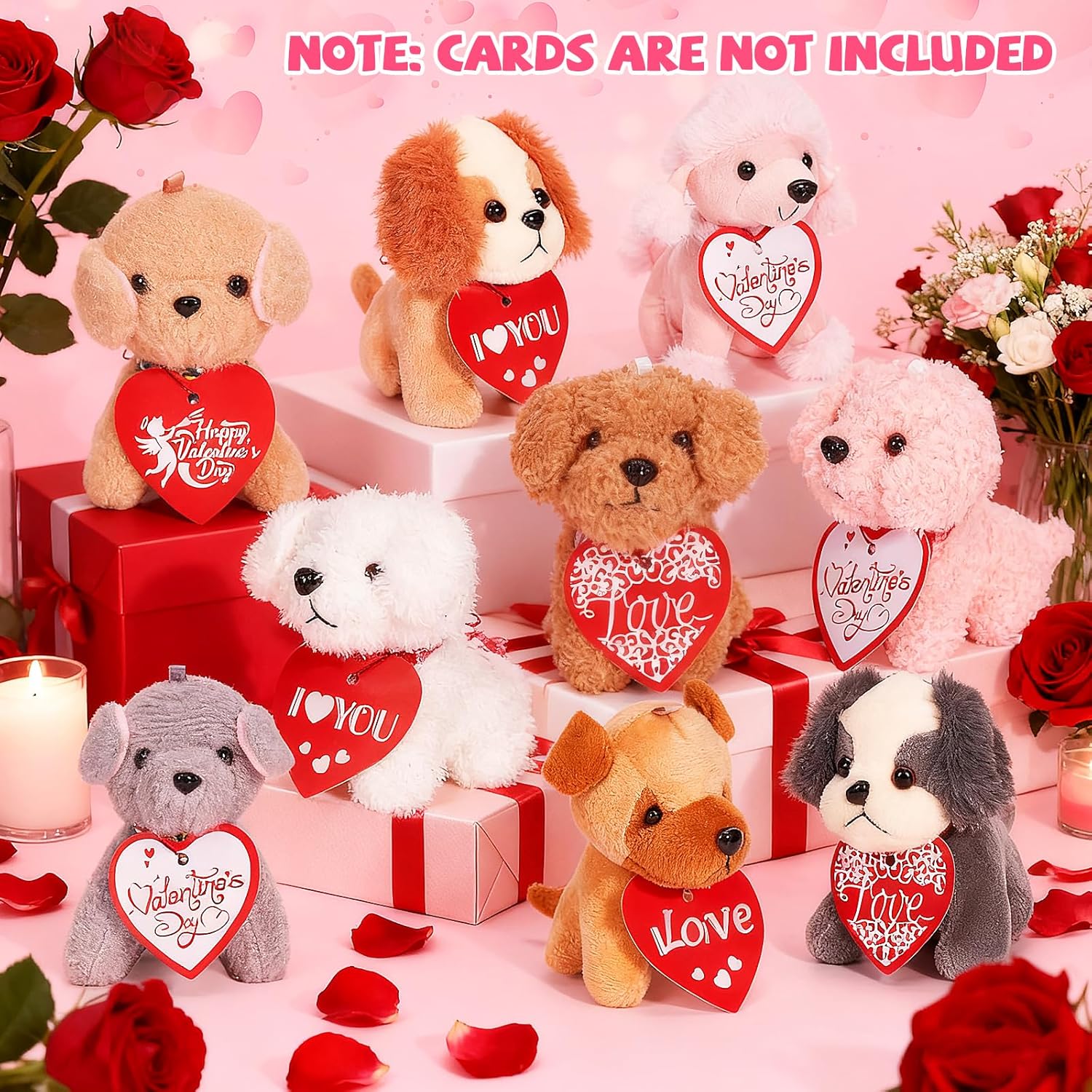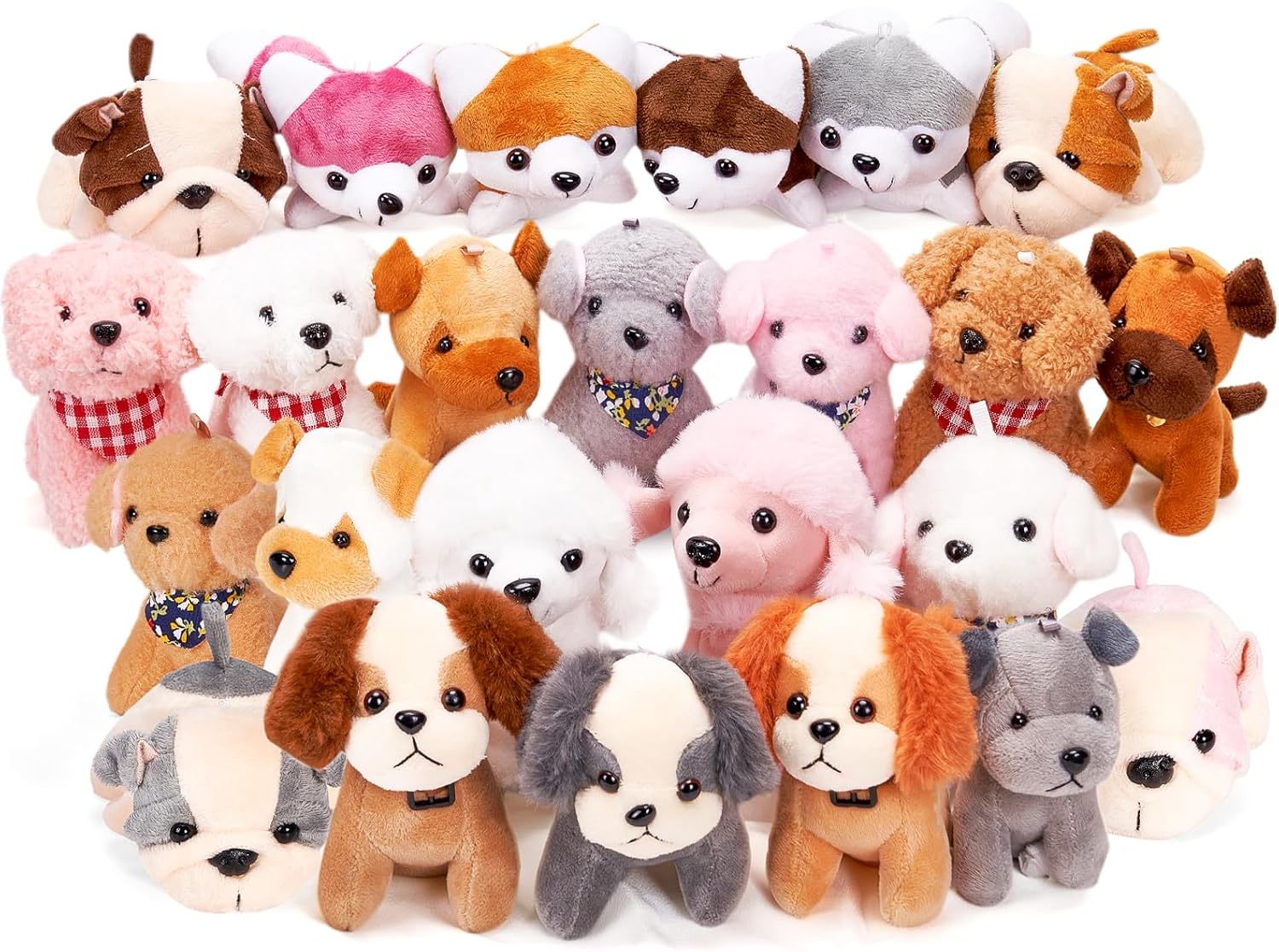 24 DIFFERENT PUPPIES (4-5in): The mini stuffed animal dog set contains 7 different types of little puppies. There are 4 Teddy dogs with flower-patterned scarves, 3 Teddy dogs with red checkered scarves, 2 Poodle dogs, 4 Shar-Pei dogs, 3 Golden Retriever dogs, 4 Husky dogs, and 4 Doberman dogs. Their colors vary, mainly including light brown, white, gray, and pink. Little ones in class and party will love these adorable puppies.