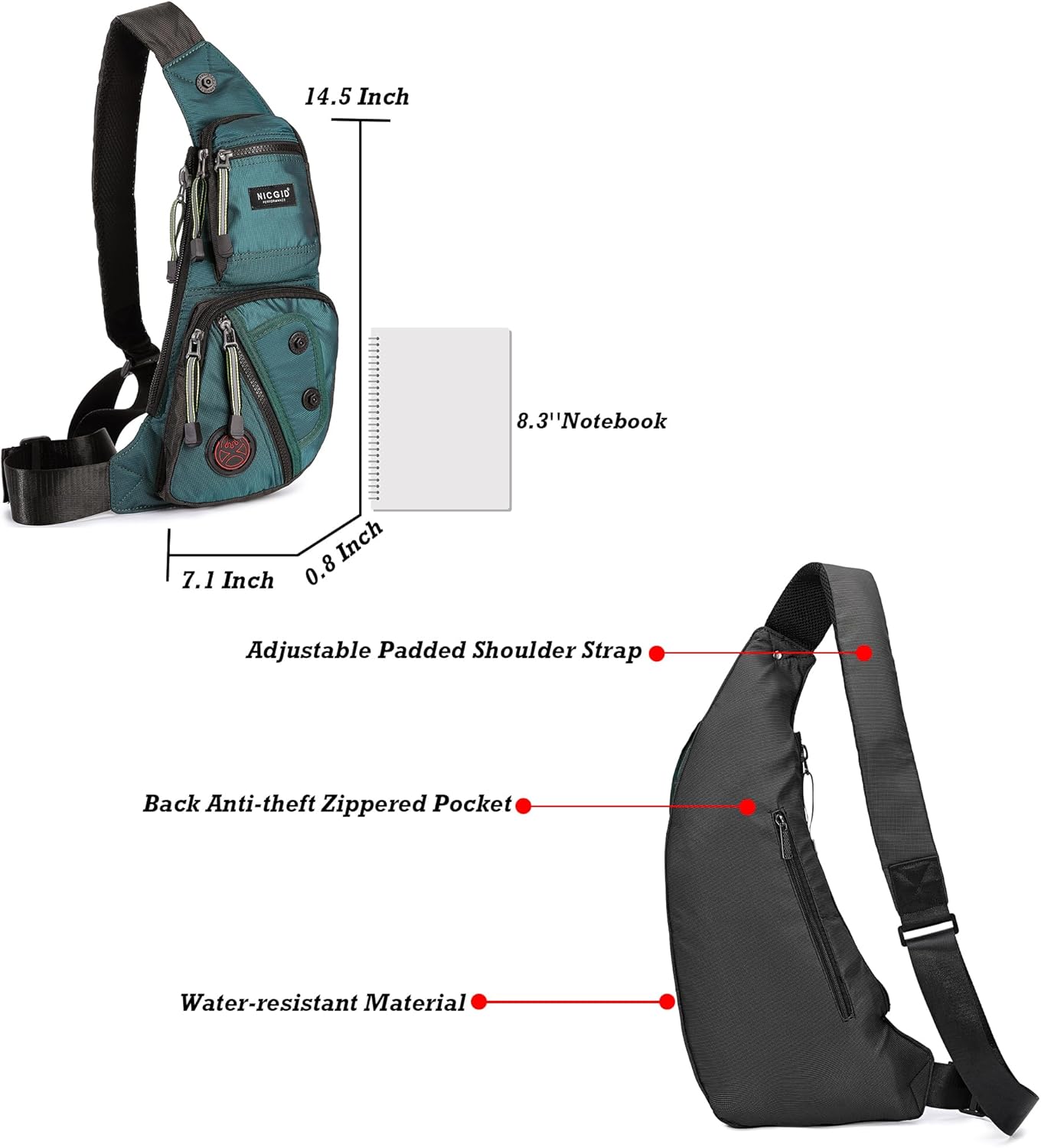 Material: This sling bag is well constructed of water-resistant nylon material. Lightweight, strong and sturdy. Not easy to be scratched. The size of it is bigger than a fanny pack, but not as big as a backpack.