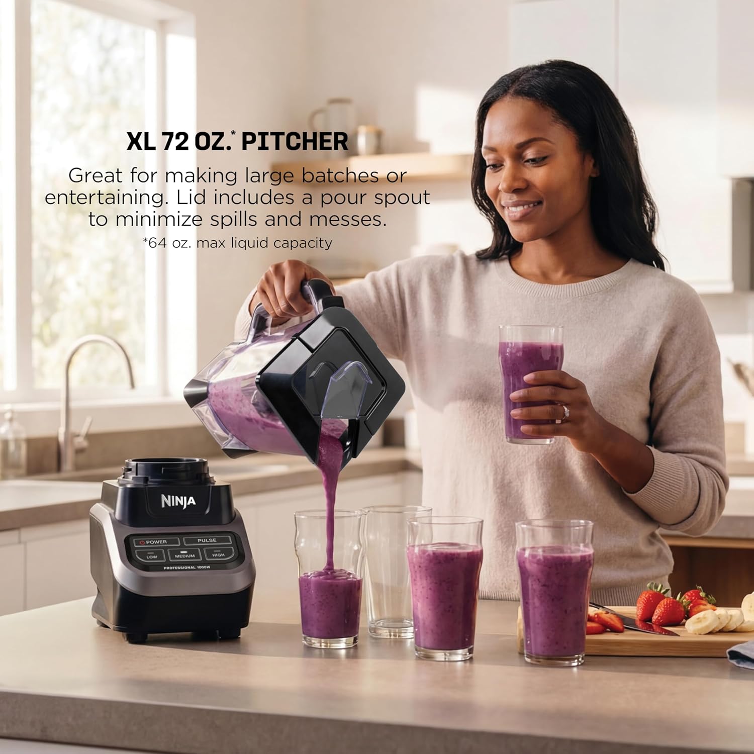 XL CAPACITY: The 72 oz professional blender pitcher is excellent for making frozen drinks and creamy smoothies for the entire family. 64 oz. max liquid capacity