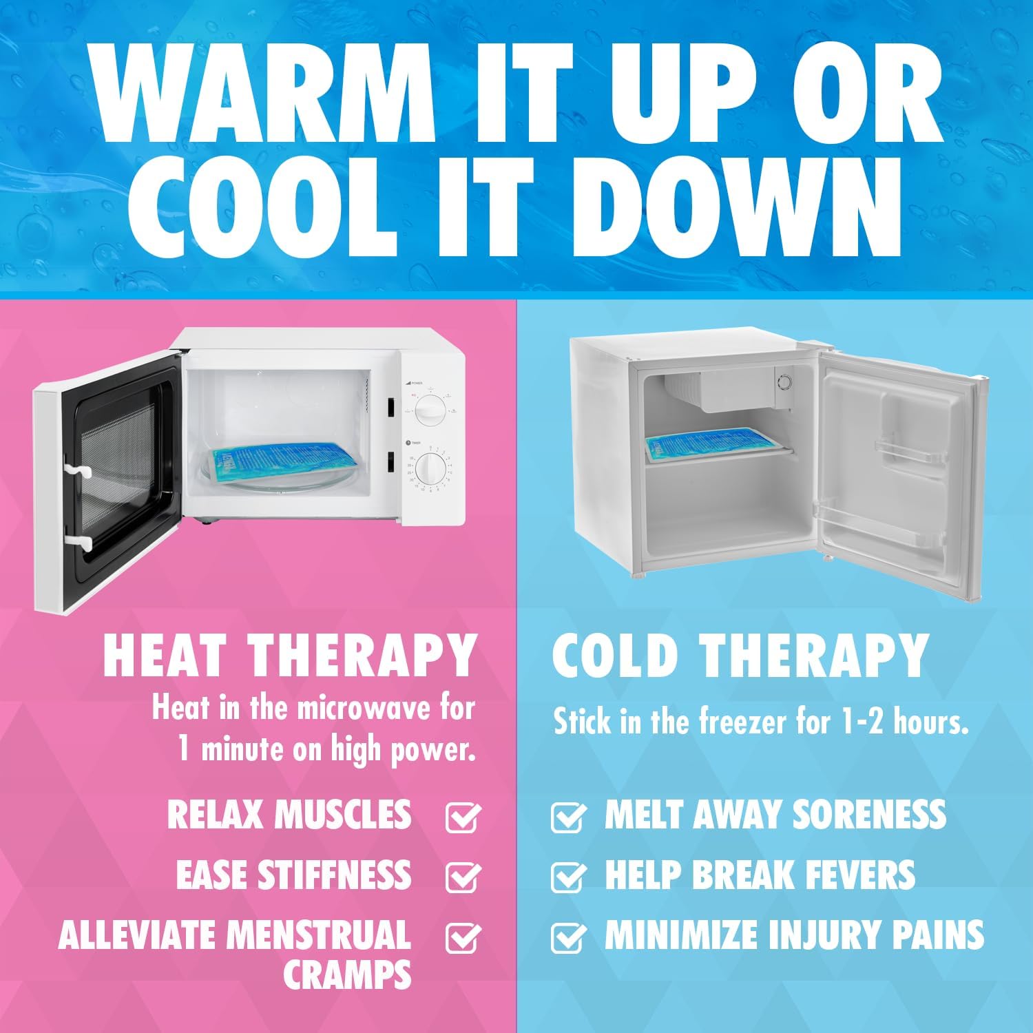 FOR HOT AND COLD COMPRESS: Struggling with cramps or a stomach ache? Our soft ice packs also work like hot water bottles, providing soothing heat therapy. You can count on our hot and cold pack for pain relief whenever and wherever you need it.